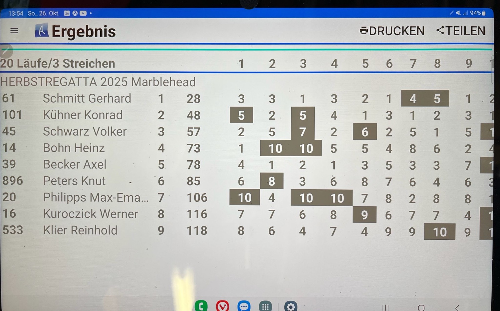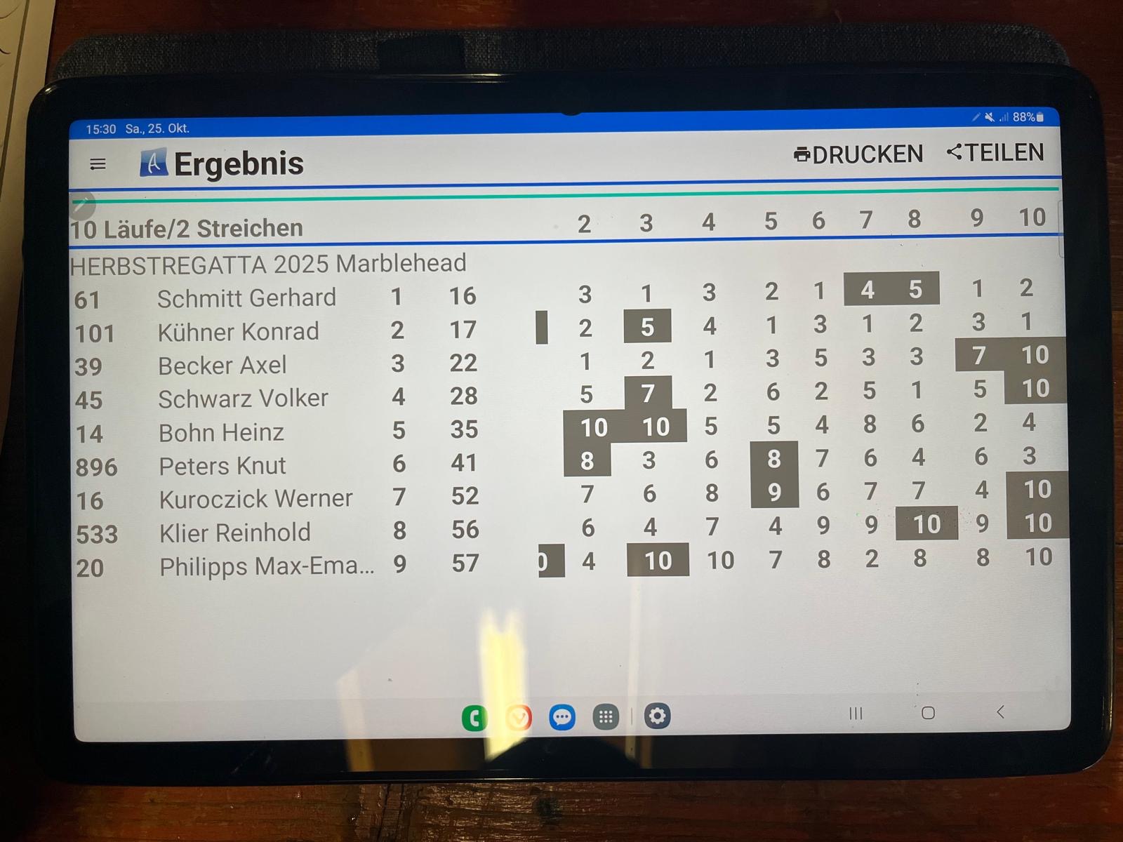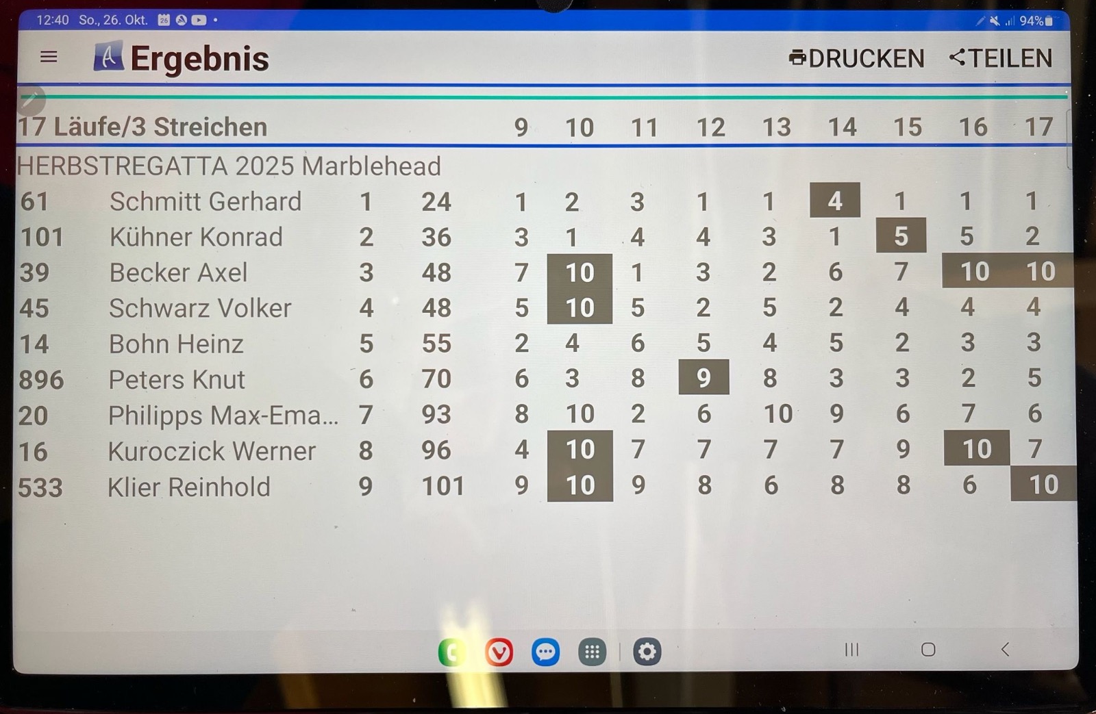 Wie ihr dem Ergebnis entnehmen könnt, siegte Gerhard Schmitt sehr souverän. Nach Jahren des Tüftelns an seiner JethRail hatte er einen neuen Mastkoker an veränderter Position eingebaut – und endlich zeigte das Boot seine Leistungsfähigkeit bei starkem Wind. Böen setzte es nun selbstständig in Speed und kontrolliertes Anluven um, ohne dabei zu überziehen.