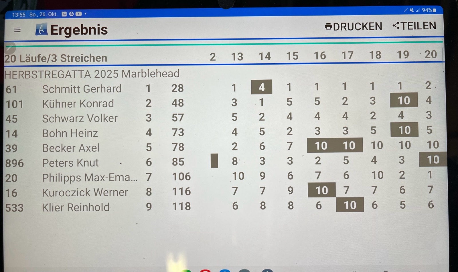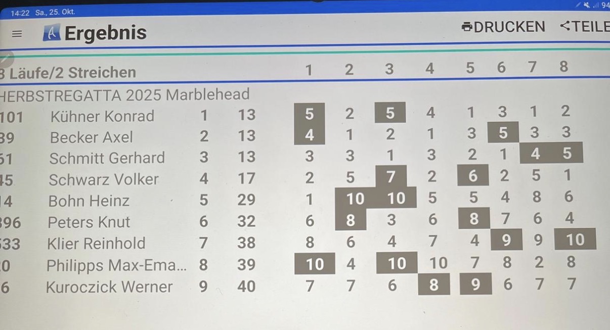 Schön, dass wir mit Heinz Bohn aus Jüchen und Knut Peters aus Berlin auch zwei wirklich weit angereiste Segler unter uns hatten. Allen Teilnehmern hat die traditionelle Herbstregatta am Feringasee wieder sehr gut gefallen. Nochmals vielen Dank an alle Ausrichtenden und Unterstützer – wir freuen uns schon aufs nächste Jahr!