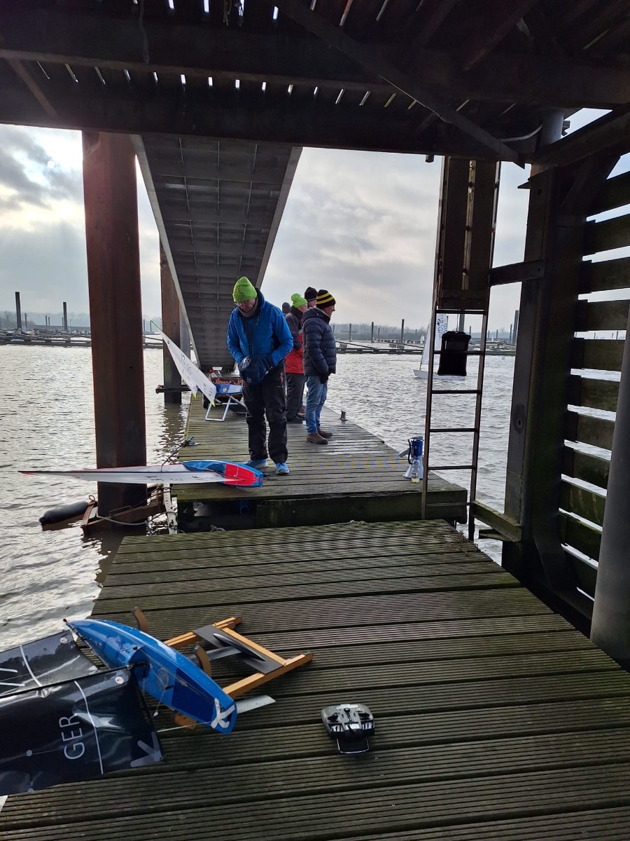 Vorweg, schade dass von den 11 Gemeldeten 5 abgesagt hatten. Schade für die, die nicht teilnehmen konnten. Der Wind war beständig, gute A-Rigg-Bedingungen mit leichten Winddrehern von der Elbe in den Wedeler Yachthafen hinein parallel zum Steg. Super Blickbedingungen auf die Regattastrecke. Wenn man gewollt hätte, hätte man sogar aus einer Höhe von 3 Metern eine totale Übersicht aufs Geschehen gehabt, ideal für Teilnehmer, die schlecht zu Fuß sind. Nach 2 Läufen fiel Jürgen Lewald aus, da waren`s nur noch 5. Der frische Wind war anfangs unangenehm kalt, aber gegen Mittag klarte es auf .Als die Sonne noch zu scheinen begann, war beste Laune angesagt. Gegen Mittag wurde es unruhig auf dem Wasser. Die Optisegler, die ihre alljährliche Tannenbaumregatta abhielten, waren für uns ein schönes Unterhaltungsprogramm. Es war spannend zu beobachten und vor allem zu hören, wie die alten Herren in ihren Kinderbadewannen ums „Blaue Band“ kämpften. Einer der Herren zeigte uns auf unserer Regattabahn, wie man eine Rollwende besser nicht macht, kenterte, lenzte seine Yacht und segelte weiter. Plötzlich und unerwartet tauchte der ehemalige und gute RC Segler Tobias Vogt auf. Er lebt jetzt wieder in der Nähe von Wedel und nachdem er von seiner alten Test 5 erzählte, die er für unser Treffen nicht rechtzeitig flott machen konnte, bot ich ihm für 3 Läufe meine Lintel an. Das Angebot wollte er nicht ausschlagen. Ich hoffe, er kommt wieder. Außer, dass wir viel Spaß hatten und ein schönes Revier testen konnten. Wir erlebten die Unterstützung des Hafenmeisters. Jürgen Waschek als altes Hafenmitglied „kann gut“ mit dem Hafenmeister. Am Ende durften wir selbständig mit dem Motorboot unsere Bojen aus dem Wasser pflücken. Nebenbei erfuhren wir, dass es eine lockere Runde IOM Segler gibt, die sich bisweilen im Yachthafen treffen. Viel Werbung für unsere Sache haben wir nicht machen können, dafür aber neue Kontakte knüpfen und einen Segler vielleicht reaktivieren können.Nach 20 Läufen machten wir Schluss, Torsten hatte sich wieder nach vorne gesegelt, alle waren zufrieden und wir haben ein neues Revier auf dem Zettel. Hoffentlich wird es wirklich was.Max, GER 25