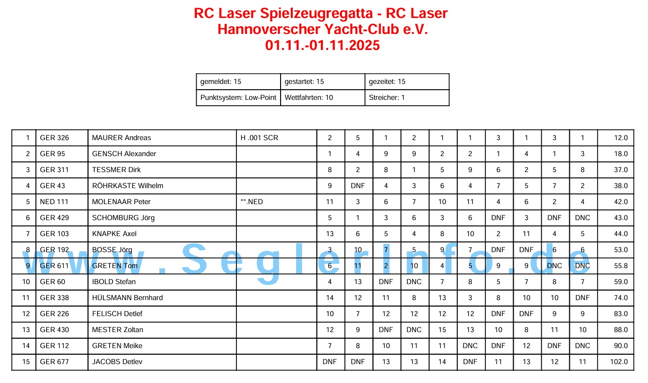 Fazit: Die RC Laser Spielzeugregatta war ein voller Erfolg – sportlich fair, technisch anspruchsvoll und atmosphärisch gelungen. Der Hannoversche Yacht-Club bot eine hervorragende Kulisse und Organisation. Zur Mittagspause nach 6 Wettfahrten gab es im HYC-Clubhaus leckere Chili con Carne und Getränke.