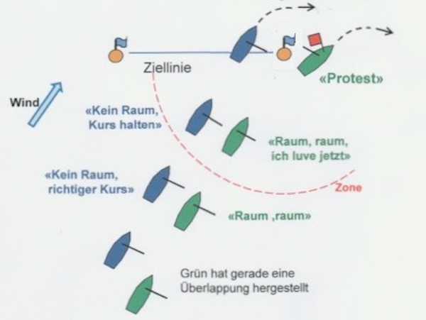 - zu Beginn stellt das grüne Boot eine Überlappung zu Blau innerhalb von zwei seiner Rumpflängen her. Nach Regel 17 darf es nicht höher als seinen richtigen Kurs segeln (wird bei uns RC-Seglern oft nicht beachtet, das Luvboot verlangt sofort nach Erlangen der Überlappung regelwidrig Luvrecht, auch über seinen richtigen Kurs hinaus). Blau muss seinen Kurs anfangs nicht ändern, muss aber nach Regel 11 darauf achten, sich frei zu halten.