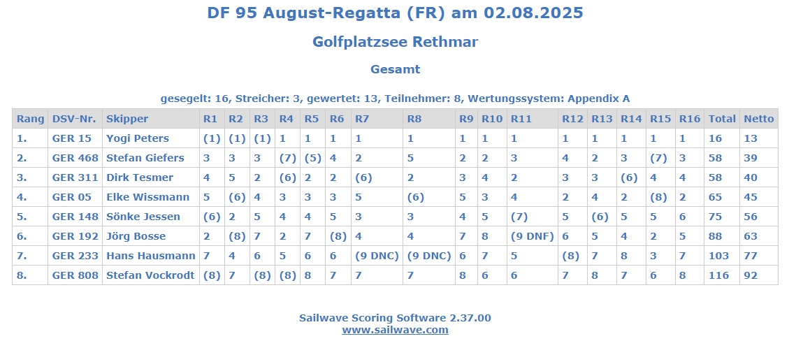 Die Eingabe der Einzelwettfahrten ins Regattaauswertungsprogramm hat dann noch zu einer kleinen Veränderung zu dem manuell ermittelten und auf der Golfplatzterrasse bei Kaffee und Kuchen verkündeten Endergebnis geführt.