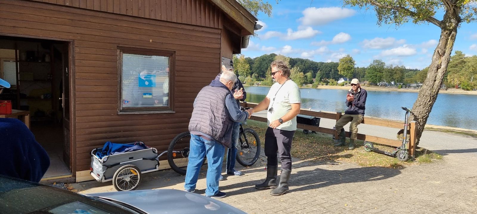 In der Ausschreibung war die letzte Wettfahrt mit 16 Uhr angegeben. Da wir nun doch schon die ein oder andere Zwangspause einlegen mussten, wollten wir noch zwei Läufe dranhängen. Das Wetter war toll, die Sonne schien wieder und der Wind war auch perfekt, kurzum: ideale Segelbedingungen. Die Voraussetzung über 16 Uhr hinaus noch zwei Wettfahrten zu segeln, bedurfte aber der Zustimmung aller Teilnehmer. Eine Gegenstimme reicht aus, dass nicht mehr gesegelt wird. Und so kam es dann auch, dass wir pünktlich um 16:00 Uhr die Segel streichen mussten. Bis dahin hatten wir 15 Läufe absolviert. Am Abend kamen wir dann noch zu einem Schnitzelessen in der am See gelegenen Gastronomie zusammen und schauten den Klassiker Borussia Dortmund vs. Bayern München. Das Essen war toll, die Bedienung war Klasse und auch das Spiel war spannend. Insgesamt ein super Abend! Was will man mehr?