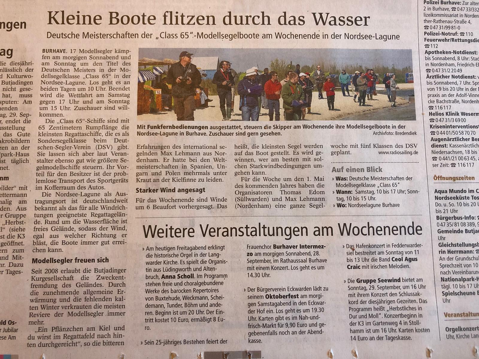 Die Deutsche Meisterschaft 2019 der C65 fand in Burhave statt. Wenn man nach Burhave eingeladen wird, heißt das, man fährt zu einem der besten Reviere für uns RC-Segler in Deutschland. Dies gilt für das Revier wie für die Organisation.
