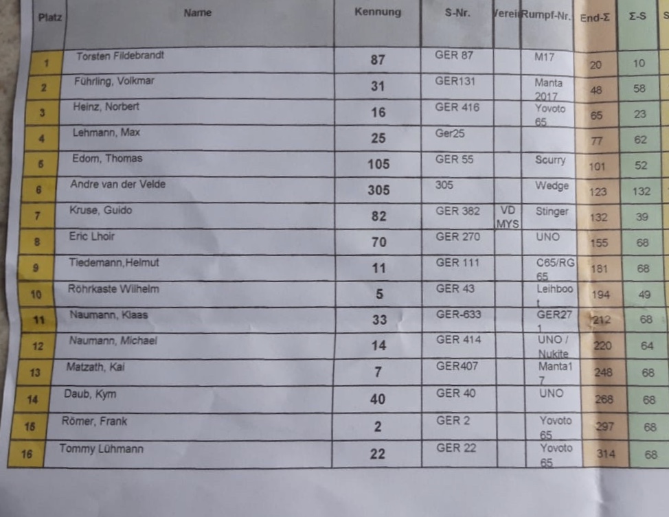 Die Meisterschaft war nach 5 von 24 Läufen eigentlich schon entschieden. So dominant, wie er, ich glaube, 20 von 24 Läufen gewonnen hat, war schon beeindruckend. Bei der IOM DM sollten wir uns mehr wehren. Herzlichen Glückwunsch Torsten zur deutschen Meisterschaft C65.