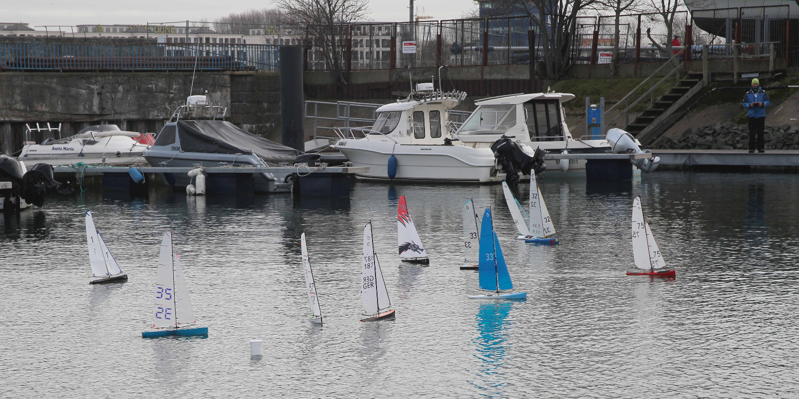So trafen Sonntag früh 10 Segler und eine Seglerin mit ihren Booten der kleinsten Regattaklasse mit 65 cm Rumpflänge im Yachthafen ein. Darunter acht „highend Custommades“ und drei Boote der preiswerten Einheitsklasse „DragonForce65“. Das Wetter meinte es gut mit uns „trocken, heiter bis wolkig“ jedoch vermissten wir die gemeldeten 9-17 kn. Im etwas geschützten Yachthafen waren wir zumindest von ordentlich Dampf im Leichtwind-Rigg mit Wind zwischen 5-10 kn bei Südwestwind ausgegangen. Anfangs herrschten etwa 1-3 kn. Der Kurs war pünktlich gelegt und alle segelten sich ein (Luvmarke mit Ablauftonne, Leegate mit Start in der Mitte des Kurses, das Ziel wurde von der Luvboje und Ablauftonne aufgespannt, 2 Runden). Jedoch wurde 10:45 Uhr kurz vor Start nochmal die Startlinie angepasst und 11 Uhr gestartet. Der erste Start lief etwas chaotisch, so dass wir nur eine Runde ohne Wertung zur „Aufwärmung“ segelten.