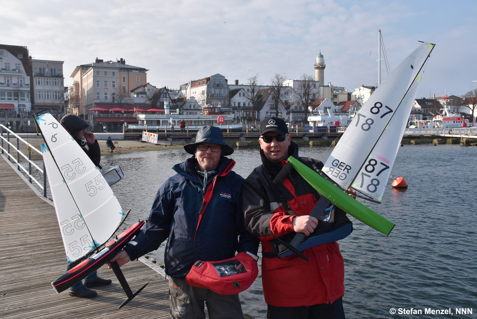 Für alle die uns aus der Ferne zusehen möchten, gibt es eine Webcam ( der-warnemuender.de/livecam.html ) ... die unterste Cam schwenkt etwa minütlich über den Regattaplatz auf der Mittelmole. Okay, Segelnummern werden vielleicht nicht im Detail erkennbar sein ;-)