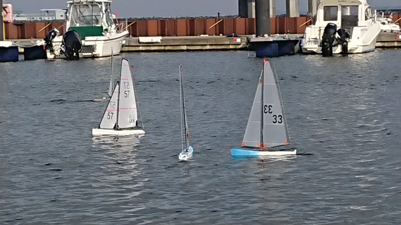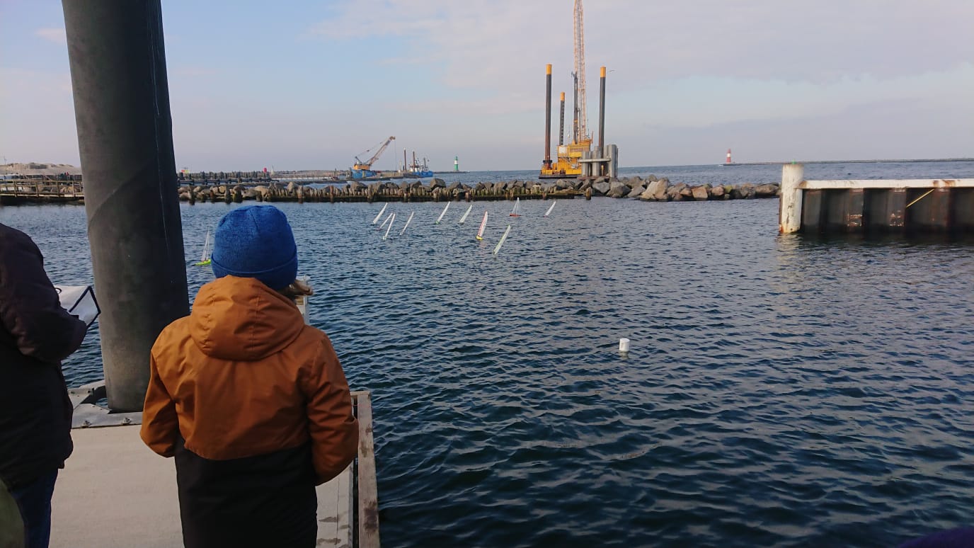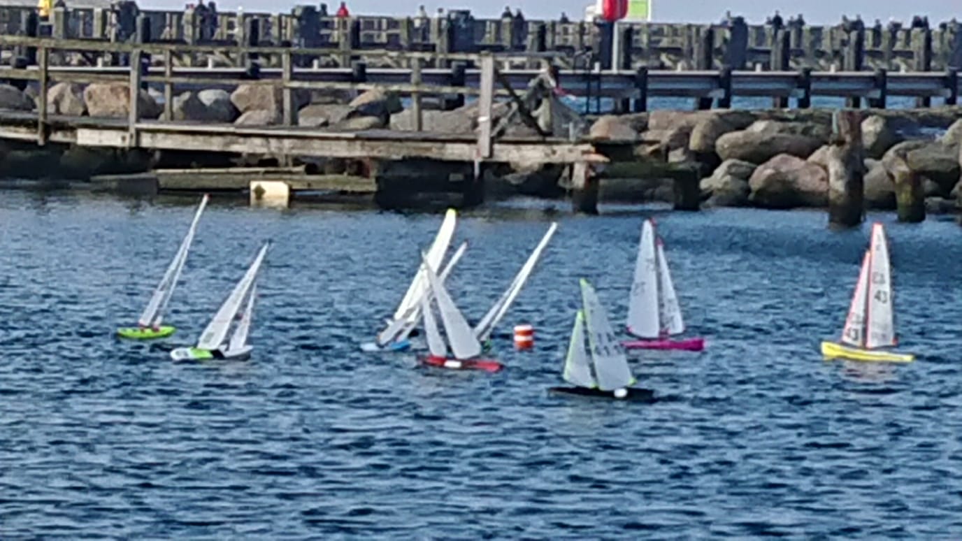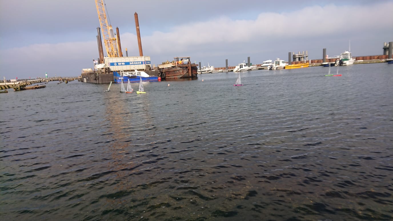 Die ersten acht Rennen wurden mit A bis A- Riggs gefahren. Anschließend drehte der Wind von anfänglich NNW-NW auf WNW und frischte etwas auf, so dass der Kurs während der Mittagspause auf die linke Seite des Pontos verlegt wurde. Dort wurden die Winddreher zu extrem und ein Rennen musste durch nicht mehr klar erkennbare Windrichtung abgebrochen werden. Der Kurs wurde nördlich des Pontons verlegt, dort war die Richtung konstanter, der Wind wehte für sportliche A- und B Rigg Bedingungen. Jedoch standen dort die Segler eng zusammen auf dem Ende des Schwimmstegs und ein großer Pfahl beeinflusste etwas die Sicht. Weitere 6 Rennen mit etwas weniger "Lottoglück" mit Winddrehern konnten ausgetragen werden. Keine A Kategorie Segelbedingungen, aber immerhin trocken und teilweise sonnig. Zur nächsten Regatta im Herbst wird sich die Lage vom Wind ohne Schwimmponton wieder verbessern, einige organisatorisch technische Details haben wir bis dahin auch weiter optimiert.