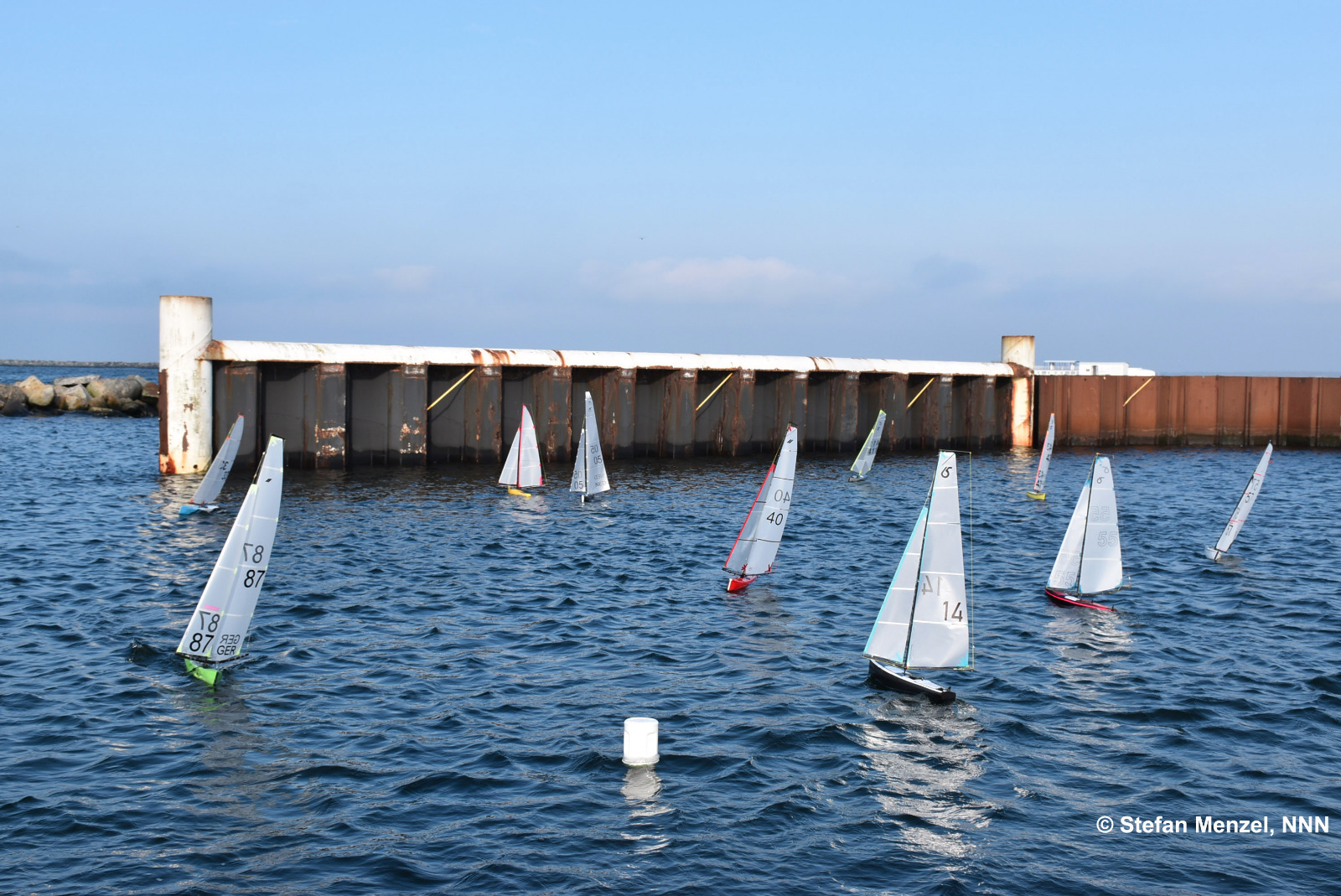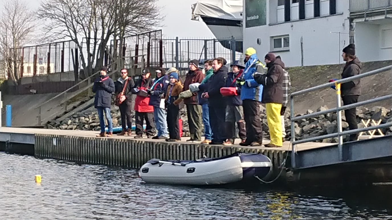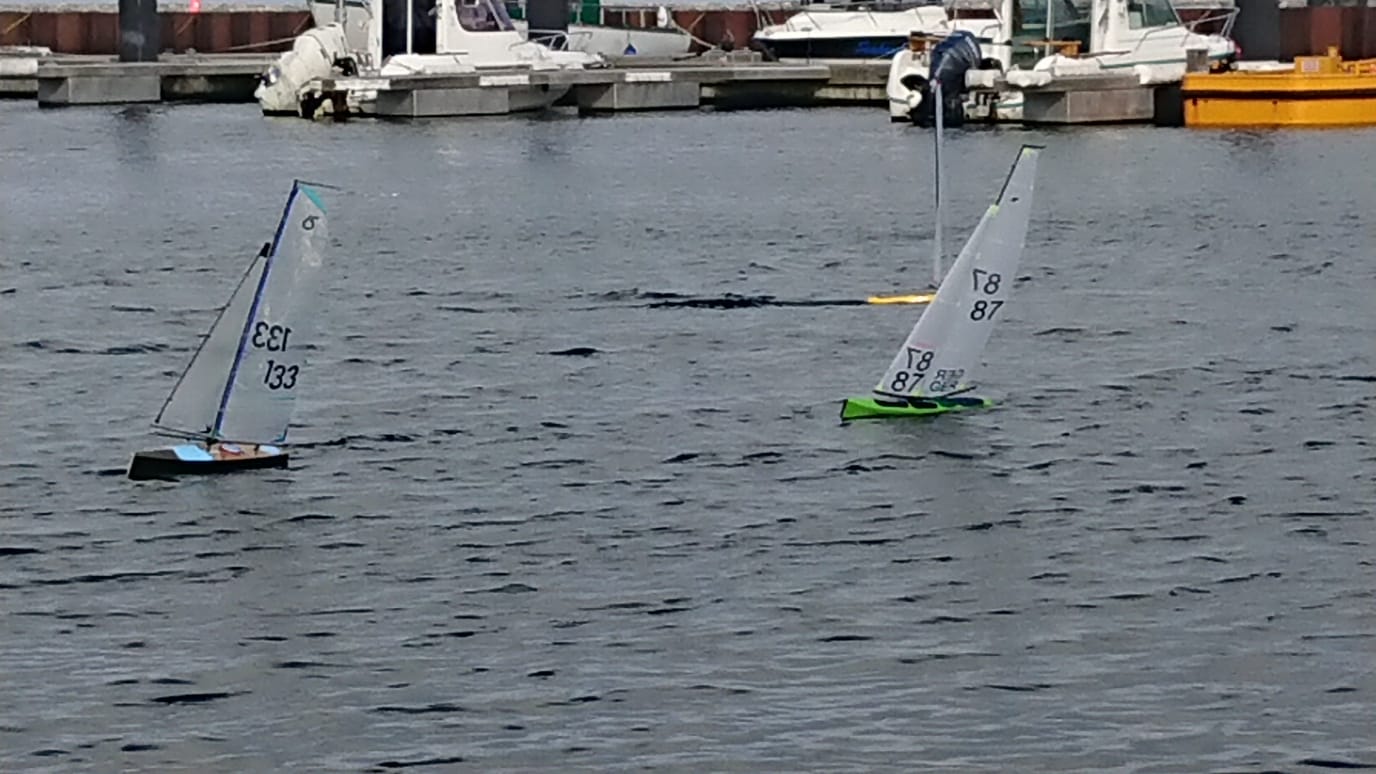 Die ersten acht Rennen wurden mit A bis A- Riggs gefahren. Anschließend drehte der Wind von anfänglich NNW-NW auf WNW und frischte etwas auf, so dass der Kurs während der Mittagspause auf die linke Seite des Pontos verlegt wurde. Dort wurden die Winddreher zu extrem und ein Rennen musste durch nicht mehr klar erkennbare Windrichtung abgebrochen werden. Der Kurs wurde nördlich des Pontons verlegt, dort war die Richtung konstanter, der Wind wehte für sportliche A- und B Rigg Bedingungen. Jedoch standen dort die Segler eng zusammen auf dem Ende des Schwimmstegs und ein großer Pfahl beeinflusste etwas die Sicht. Weitere 6 Rennen mit etwas weniger "Lottoglück" mit Winddrehern konnten ausgetragen werden. Keine A Kategorie Segelbedingungen, aber immerhin trocken und teilweise sonnig. Zur nächsten Regatta im Herbst wird sich die Lage vom Wind ohne Schwimmponton wieder verbessern, einige organisatorisch technische Details haben wir bis dahin auch weiter optimiert.