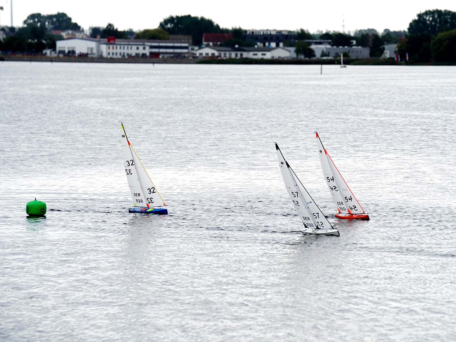 Am Samstag hatte sich ein kleines aber feines Feld von 7 IOM Fahrern eingefunden und es konnten 30 Rennen zwischen 10:45 – 17:10 Uhr absolviert werden. Der Wind wehte mit 5-10 kn einzelne Böen teilweise bis 15 Knoten. Die Windrichtung war wenig stabil, schwankte gebunden an Wolkenfronten zwischen Südwest (sideshore) bis West (side-offshore), zurück nach Südsüdwest (side-onshore) und drehte zum späten Nachmittag wieder nach Südwest. Der Kurs musste daher im Tagesverlauf etwa 5-6 Mal korrigiert werden und bestand aus Luvtonne mit Ablauftonne, Lee Gate und Start /Ziel in der Mitte. An der Spitze war es häufig einsam für die „grüne 87“, jedoch nicht unspannend, da die Führung auch mal wechselte und das Verfolgerfeld mit Segelnummer 54 und 57 recht eng in seiner Heckwelle fuhr. Der Rest des Feldes war zwar nicht soweit abgeschlagen, konnte aber im Spitzentrio selten mitmischen. Gegen Mittag verließ uns Seglnummer 235 für ein Sommerfest seines Tauchclubs und die Segelwinde im Leihboot für meinen Kumpel Philipp bewegte sich leider nach einem Akkuwechsel nicht mehr. Bis dato war die Widget immer zuverlässig gelaufen. Schade, so fuhren wir mit 5 Fahrern weiter. Parallel segelten sich schon mal drei 65er Yachten für Sonntag ein. Nach Rennen 24, gab die Regattaleitung die Richtung vor: "wir machen die 30 Läufe voll, um die Zeit bis zum abendlichen Grillen auf dem Vereinsgelände des Segelvereins zu nutzen". In der Tageswertung siegte Torsten mit 30 Punkten in gewohnter Souveränität, gefolgt von Ralf mit 55 Punkten und Jürgen mit 61 Punkten. Die beiden Segler waren den gesamten Regattatag eng zusammen, dabei konnte Ralf sechs Laufsiege und Jürgen zwei verbuchen. Um Platz 4 kämpften Frank (117 Punkte) und ich (105 Punkte) ebenfalls recht hartnäckig. Insgesamt ein langer aber schöner Segeltag!