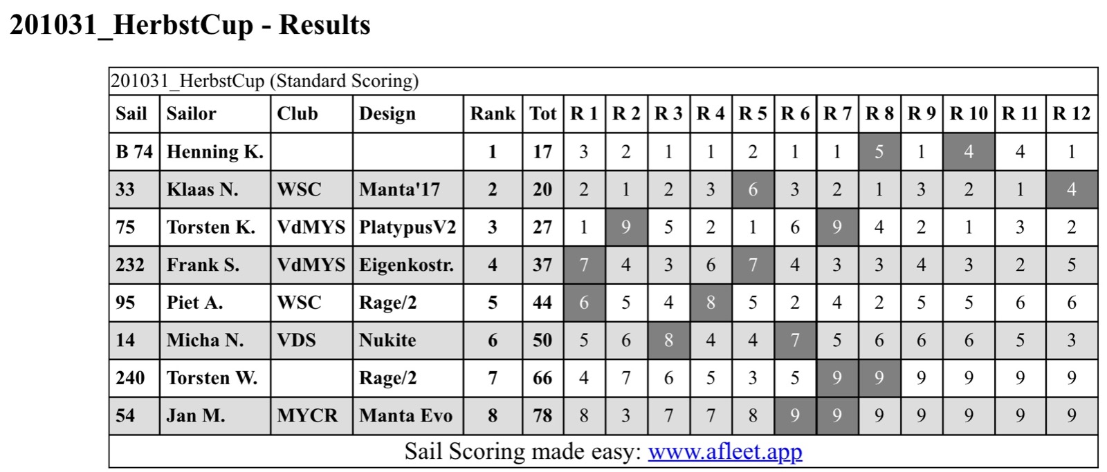 Nach 12 Läufen hat Henning unser „Exil-Brasilianer“ mit seiner „Little Best“ von Paolo Stier gewonnen. Spaß beiseite, er hat dort ein paar Jahre gelebt, ist nebenbei RC gesegelt und ist nun zurück. Heute hatte er seinen Einstand in unserem Regionalteam. Zweiter, der Junior vor Torsten mit seiner jüngsten Schnabeltierversion. Piet, unser zweiter Junior im Team, zeigte auch sein Potenzial mit zweiten Plätzen in Einzelrennen (für die Regatta hatte er sich sogar bei seinem Opti Training abgemeldet... und der Trainer ist nicht witzig).
