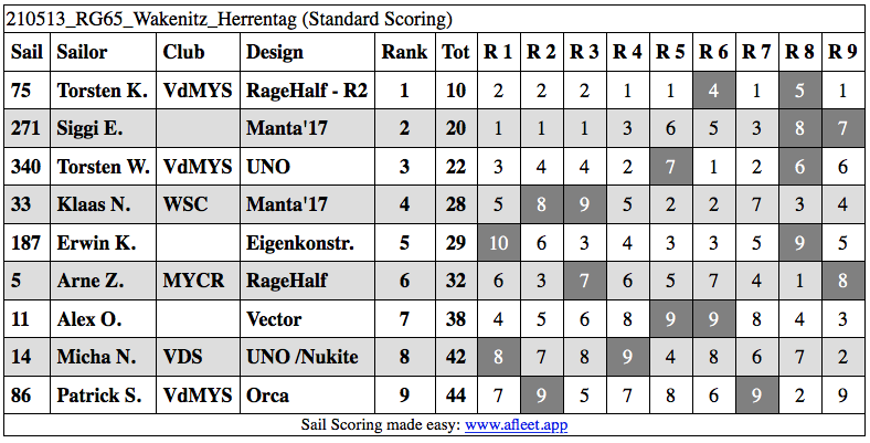 Herrentag 2021 im „echten“ Norden – „Schlingpflanzen-Riesenslalom“, Regen bis Niesel und Superleichtwind – RG 65 segeln an der Wakenitz in Lübeck.Das Match des Tages hieß „Langkieler vs. Kurzkieler“ und wer bleibt in einer der zahlreichen Schlingpflanzen stecken. Wir sprechen hier von 32-31 cm vs. 27-28 cm freie Länge. Jeden hat es irgendwann einmal erwischt und es gab schnell wechselnde Führungspositionen. Ausnahme Top-Favorit Patrick, das schlanke Rumpfdesign seiner Orca mit etwas höherem Tiefgang im Vergleich zu den anderen Shapes hing sehr häufig fest. Die Windstärke war so gering, dass die kleinste Berührung ausreichte die Schiffe zum Ruckeln zu bringen bis total Stillstand und warten auf die nächste Miniböe zur Befreiung.Wir nahmen es locker, allemal besser als am „große Jungs Tag“ zu Hause zu sitzen.