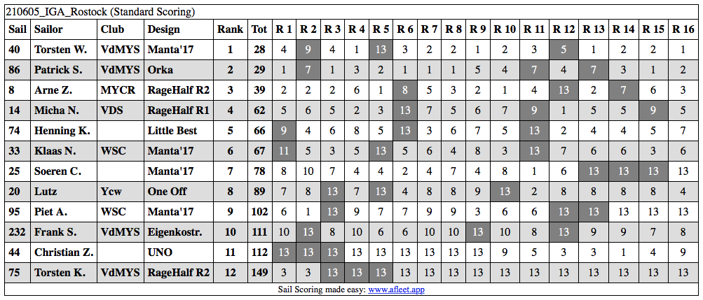 In der Gesamtwertung siegte Torsten mit einem Punkt Vorsprung vor Patrick, gefolgt von Arne. Das Spitzentrio war deutlich abgesetzt von der Verfolgergruppe. Familienmatch im Hause Naumann ging an den Senior, der Junior zeigte aber auch ein paar gute Rennen. Rund um war es ein sehr schöner Segeltag!