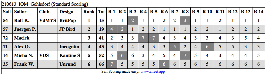 Ralf und Jürgen matchten eng zusammen sowie Alex, Maciek, Fränki und ich. Bei mir rutschte jedoch der Großbaumbesclag hoch und der Riggtrimm war mit viel Twist viel zu offen für gute Amwindwinkel. Man lernt stetig dazu und nach jeder Regatta gibt es etwas zu basteln