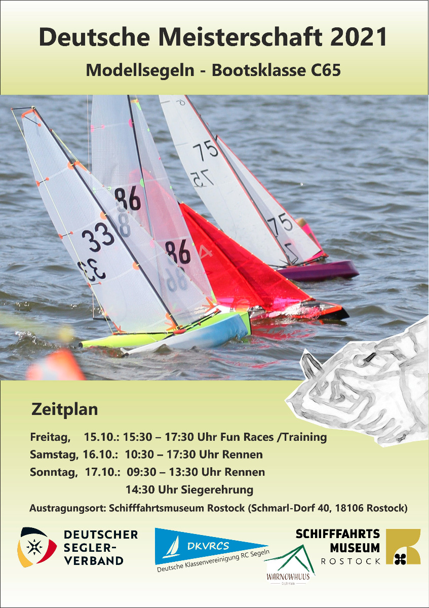 Vom 15.-17. Oktober segelt die Bootsklasse C65 ihre Deutsche Meisterschaft am Schifffahrtsmuseum in Rostock. Mit 65 cm Rumpflänge sind es die kleinsten Regattaboote im Deutschen Seglerverband und werden auch ganz liebevoll als „Kofferraumyacht“ bezeichnet. Anstatt im Boot sitzend, stehen in dieser Disziplin die Skipper mit einer Fernsteuerung in der Hand an Land. Taktische Manöver, Wettfahrtregeln und Kurse gleichen den bemannten Großbooten. Von den Entscheidungen ist es deutlich schnelllebiger und geistig fordernd, denn ein Rennen dauert nur etwa zehn Minuten. Bei guten Windbedingungen werden bis zu 20 Rennen am Tag gesegelt. Viele erfahrene Segler nutzen Modellsegeln um im Regattamodus zu bleiben, wenn das Schiff im Maßstab 1:1 im Winterlager in der Bootshalle parkt. Andere Fahrer haben Ihren Ursprung im Modellbau und befruchten die Szene mit frischen Ideen, wie zum Beispiel mit optimierten Rumpfkonstruktionen sowie Detaillösungen. Seien sie gespannt auf ein Segelereignis in „klein aber oho“!