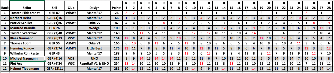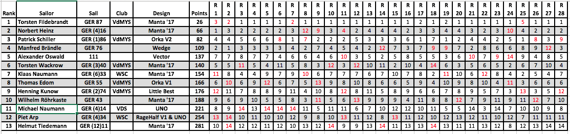 anbei die finalen Ergebnisse aus Rostock (Event-und DM-Wertung. Heute haben wir 10 weitere Rennen in guten A Rigg Bedingungen absolviert.