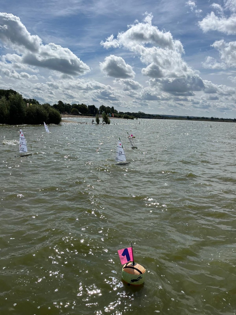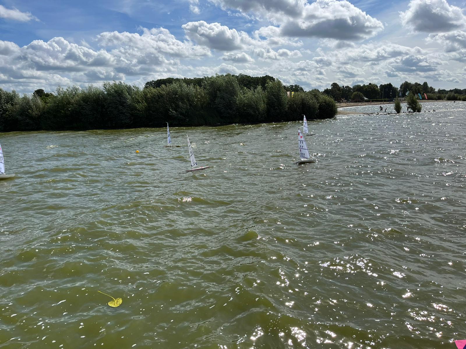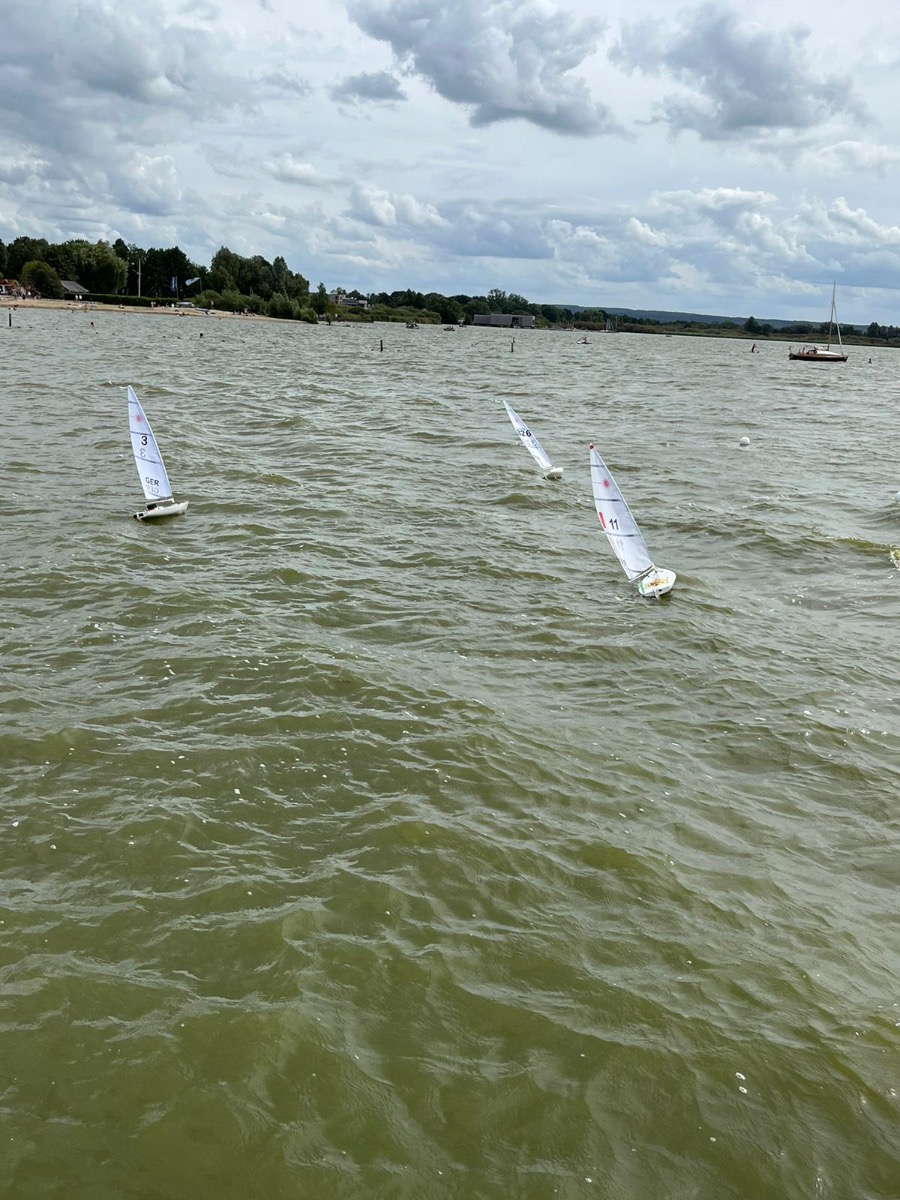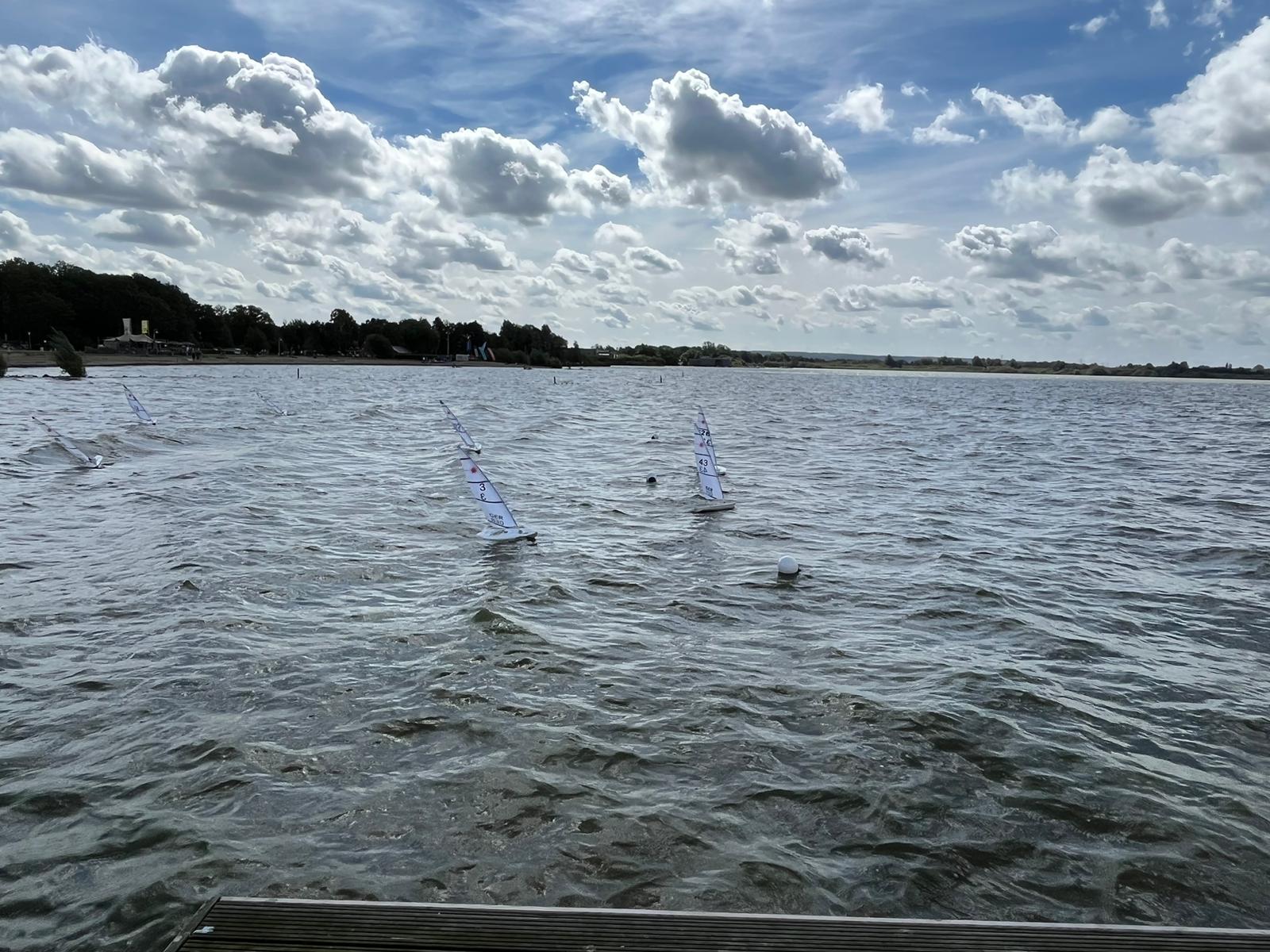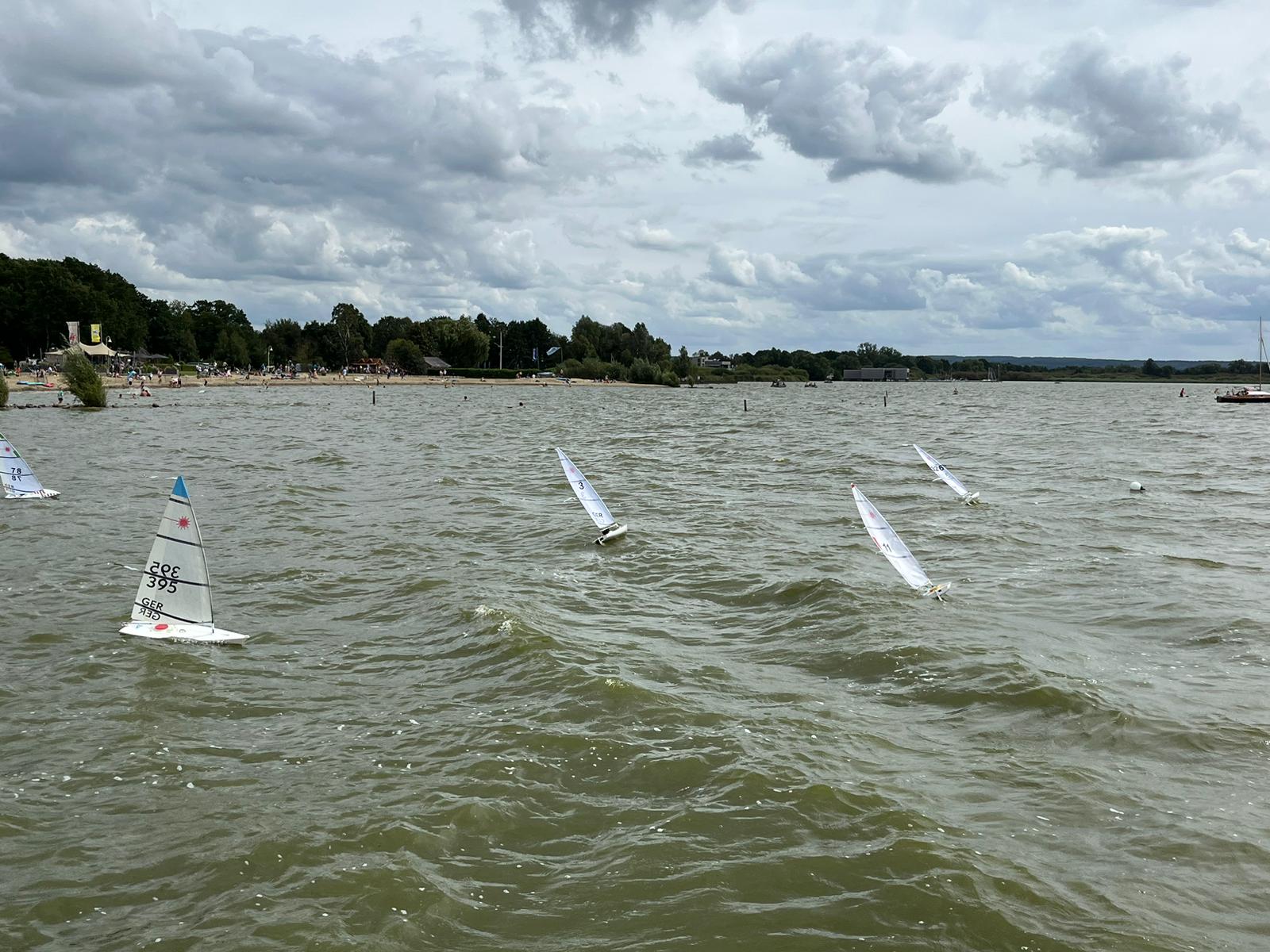 Die Wetterbedingungen waren sehr gut: trocken, sonnig mit Temperaturen über 20 Grad und wechselnden C-/B-Segelbedingungen ziemlich konstant aus West ohne große Dreher. Dadurch, dass sich die Welle über eine lange Strecke über den See aufbauen konnte, waren die Wellen im Regattagebiet relativ zur Bootsgröße recht groß und etwas ungewohnt, da es auf den meisten anderen RC Segelrevieren doch mehr kleinere Wellen gibt.