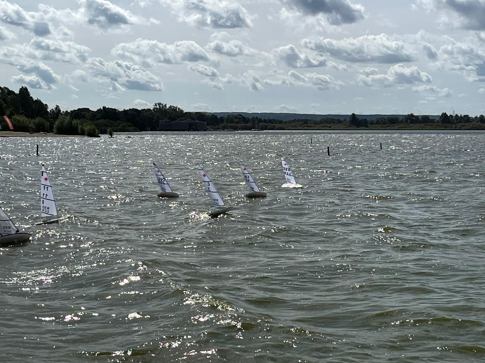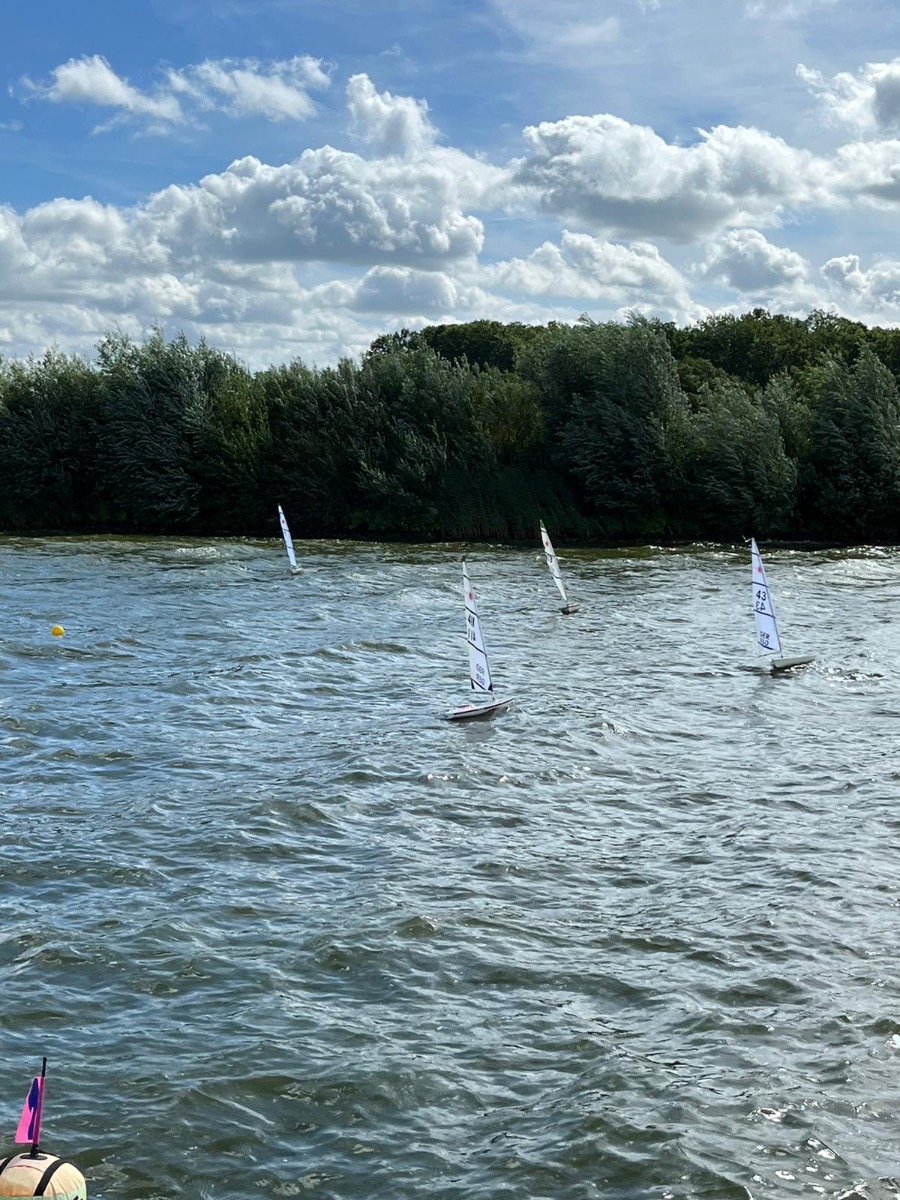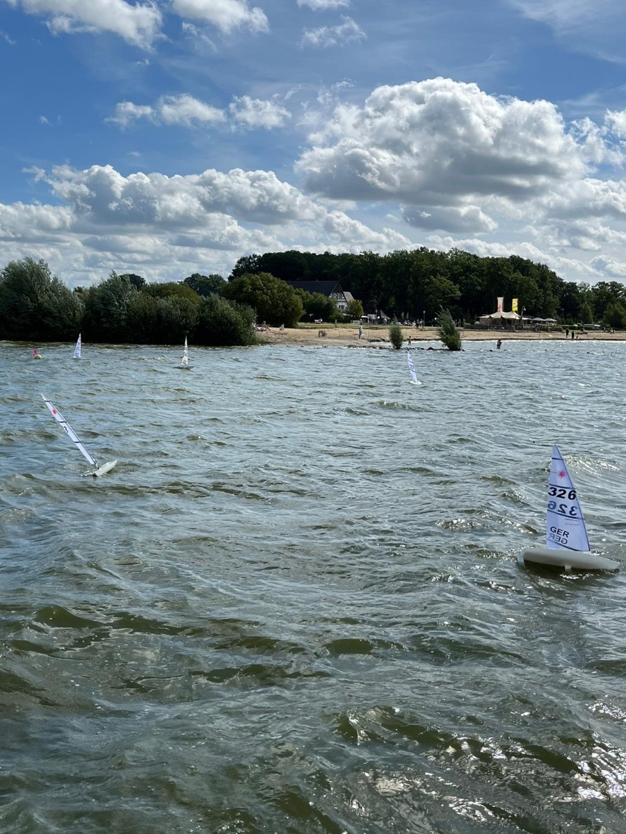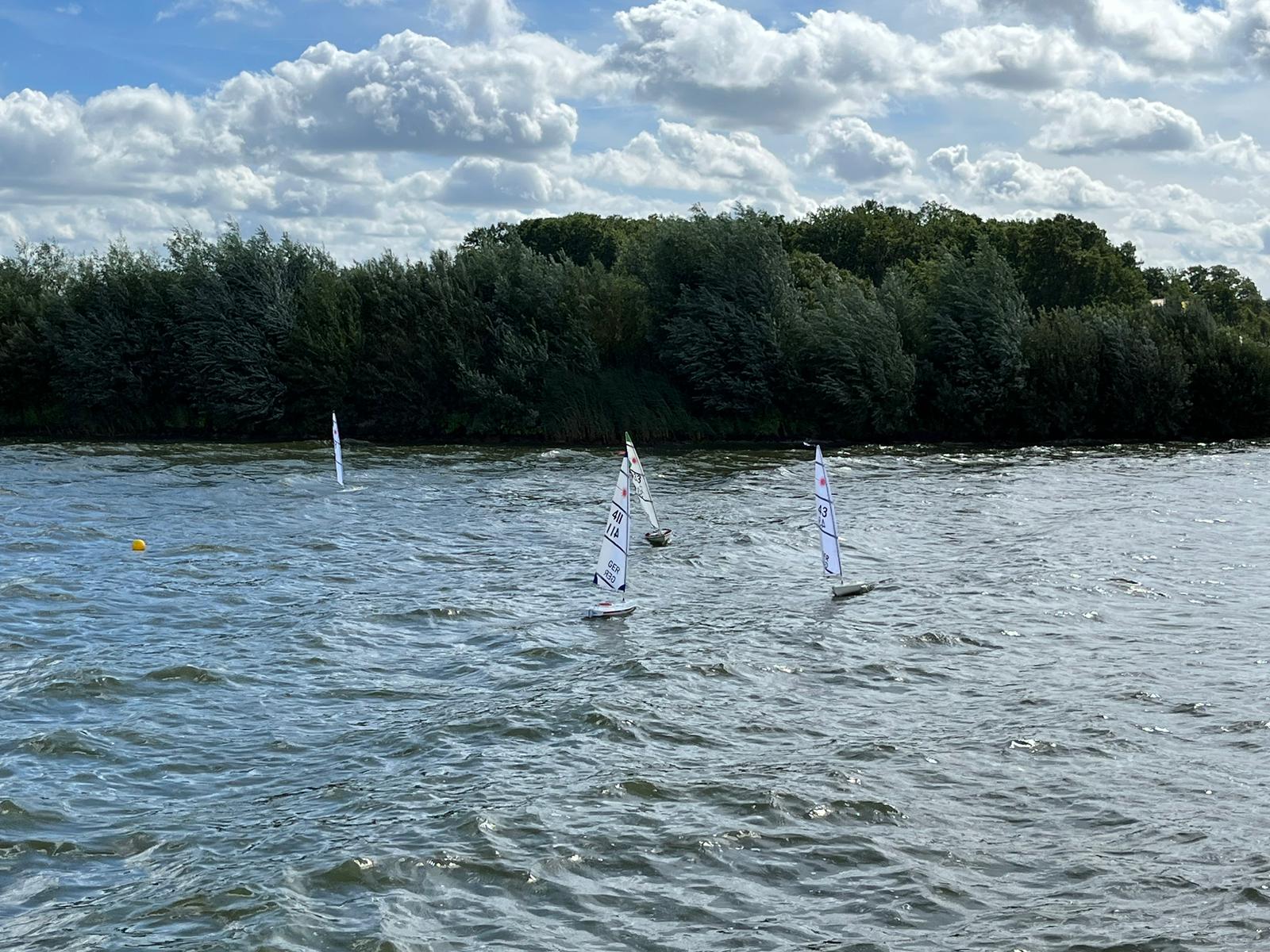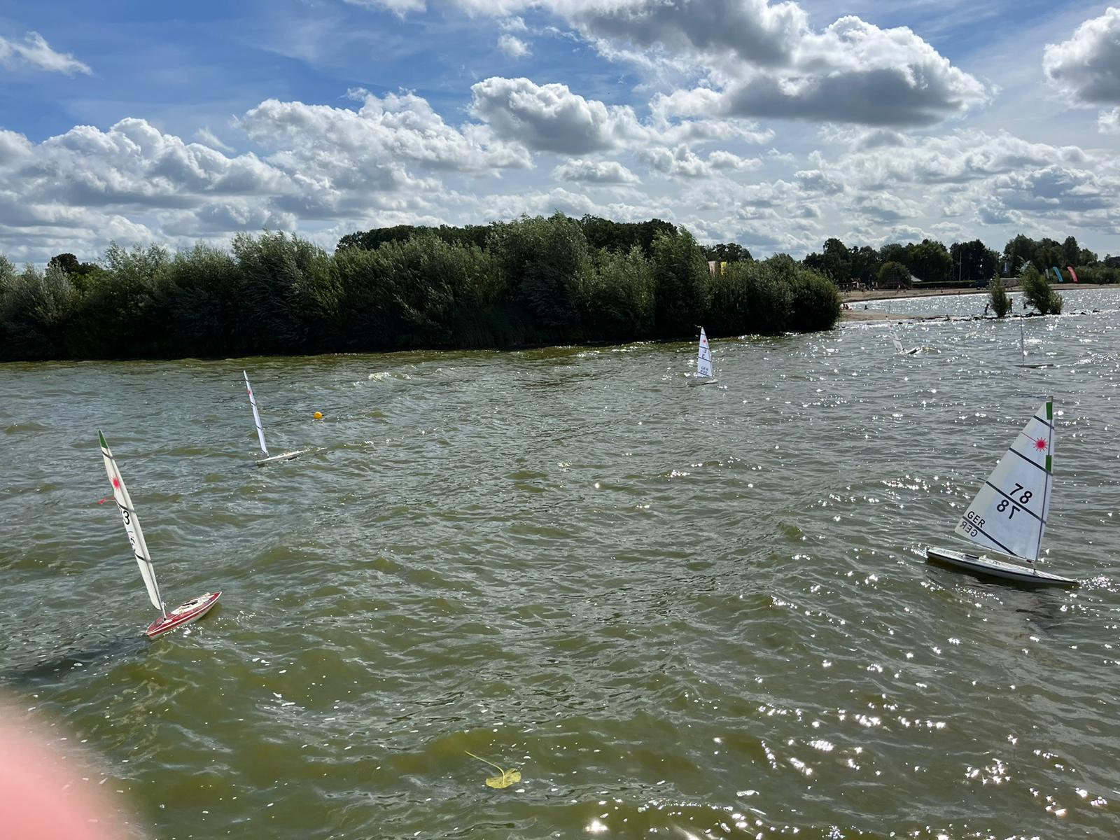 Die Wetterbedingungen waren sehr gut: trocken, sonnig mit Temperaturen über 20 Grad und wechselnden C-/B-Segelbedingungen ziemlich konstant aus West ohne große Dreher. Dadurch, dass sich die Welle über eine lange Strecke über den See aufbauen konnte, waren die Wellen im Regattagebiet relativ zur Bootsgröße recht groß und etwas ungewohnt, da es auf den meisten anderen RC Segelrevieren doch mehr kleinere Wellen gibt.