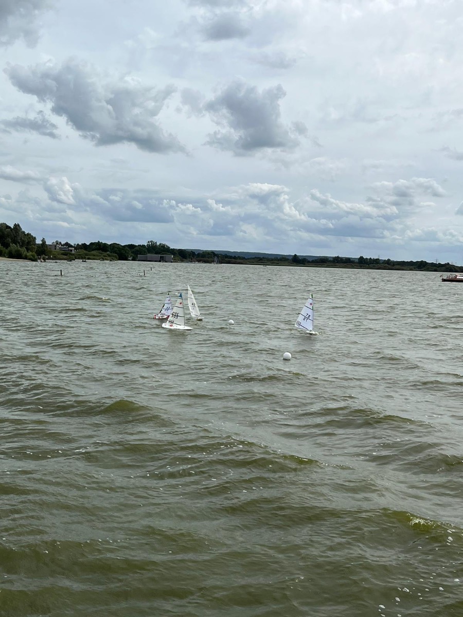 Durch eine falsche Einstellung des Schotwegs hatte sich die Schot bei meinem Boot in der 2.Wettfahrt in die Segelwindenrolle gezogen und der RC Laser machte sich schnell, wie an einem Faden gezogen, schnurstracks in Richtung des Westufers des Dümmersees auf. Da auch die Fernsteuerung irgendwann auch nicht mehr reagierte, musste Horst als Rettungsbootfahrer angeheuert werden. Mit dem kleinen Elektromotor hatte das Schlauchboot gegen den Wind und die relativ hohen Wellen sehr anzukämpfen, um den RC Laser dann doch noch einzuholen und zurück an den Steg zu bringen. Ein großes Dankeschön dafür an Horst.