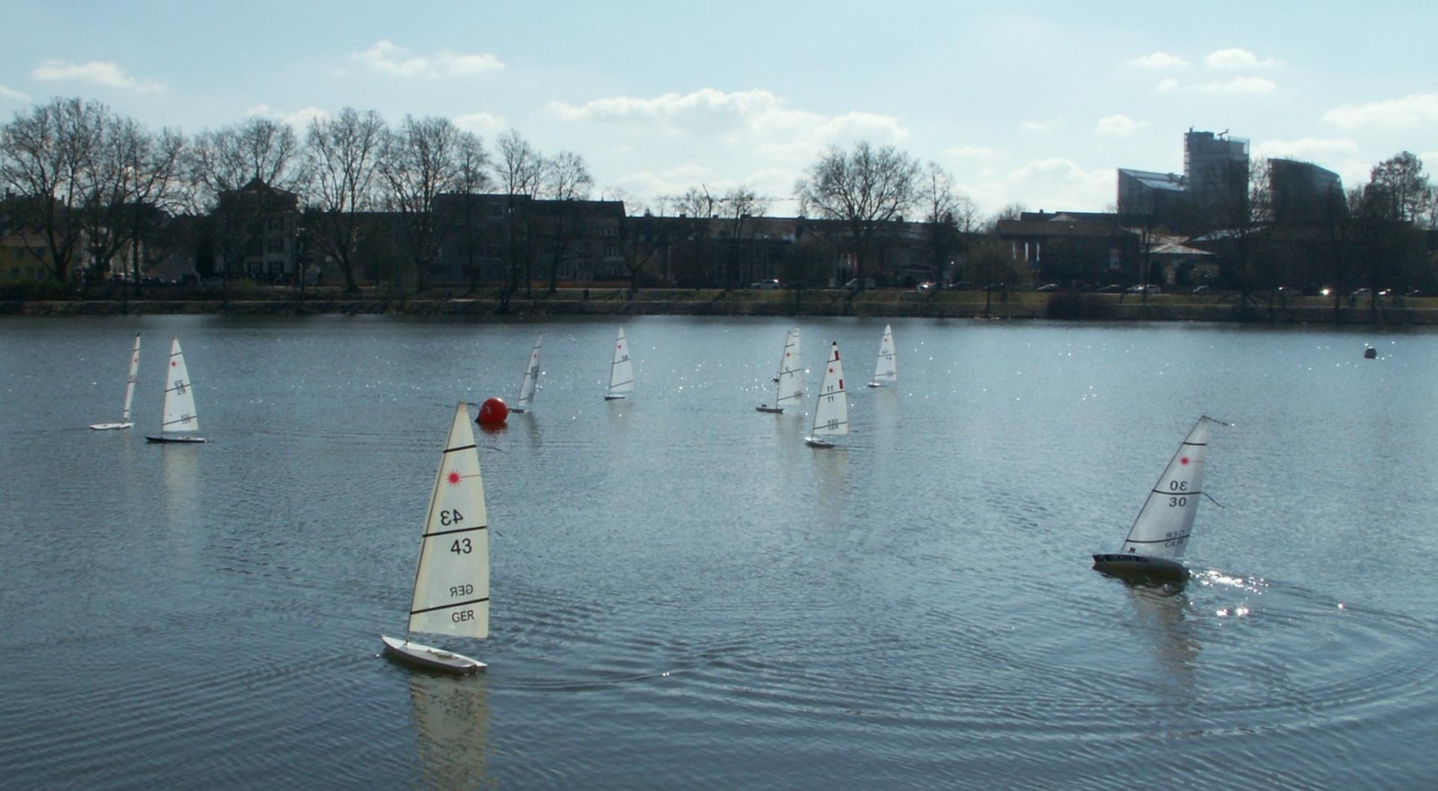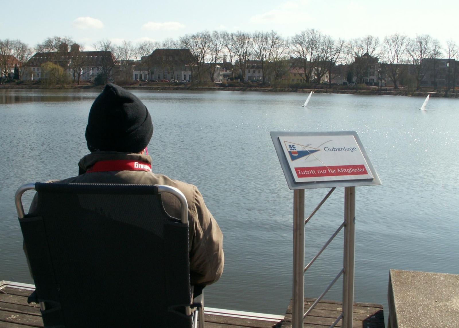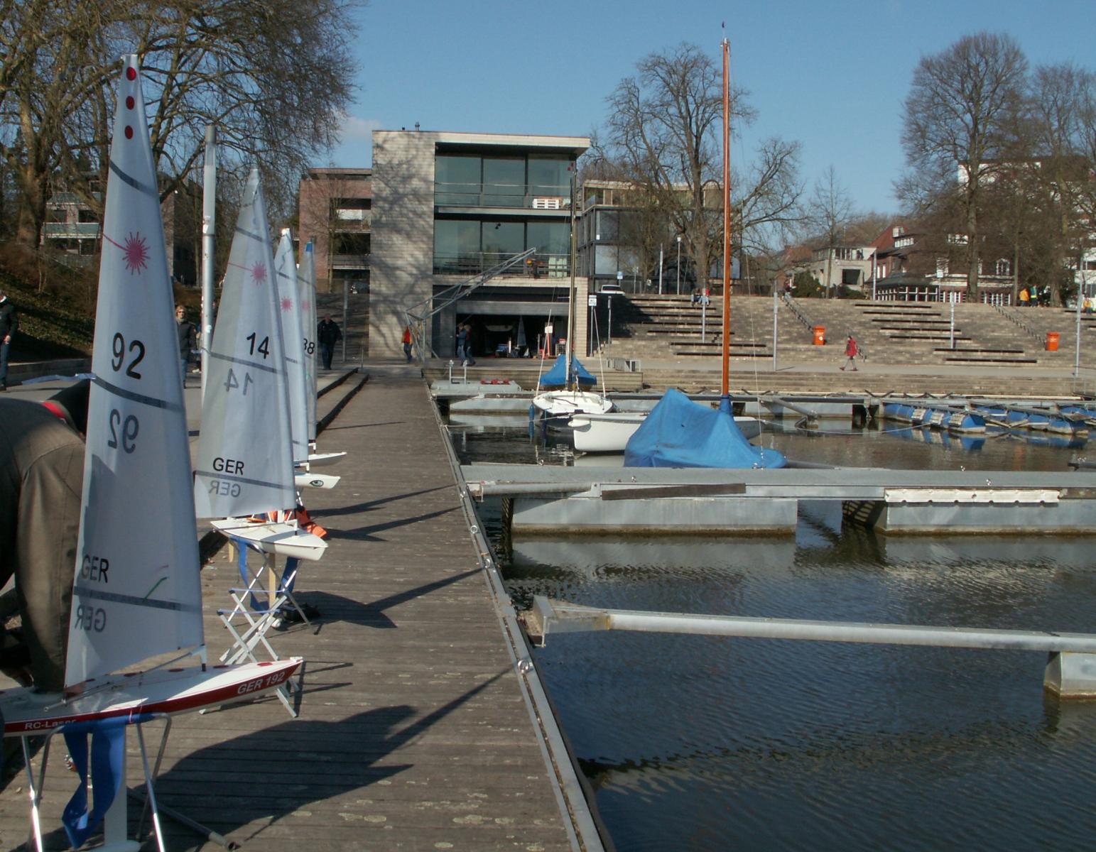 Der Segel-Club Münster liegt am nördlichen Ende des von Südwest nach Nordost gelegenen künstlichen Sees und bietet i.d.R. ideale Bedingungen für RC-Segler. Der Club verfügt über mehrere Schwimmstege, über die der Zugang zum Wasser auch ohne Hilfsmittel problemlos bewältigt werden kann. Das Clubhaus geht über 3 Etagen und beherbergt in der obersten Etage eine Messe mit angeschlossener Küchenausstattung, die für Veranstaltungen zur Verfügung steht. Der Zugang befindet sich auf Straßenniveau, während das Bootslager auf Höhe des Uferweges liegt. Eine große Steintreppe verbindet das Clubhaus mit der angrenzenden Gastronomie, die am Sonntag aufgrund des schönen Wetters sehr gut besucht war.Während bei vorherrschenden südwestlichen Winden der komplette See gleichmäßig mit Wind versorgt wird, hatten wir mit nördlichen Winden mit Drehern um die eigene Achse zu kämpfen. Zumal die Windstärke zwischen 0,5 und 2,5 Beaufort schwankte. So war es auch nicht immer leicht, den Regeln der Winddreher zu folgen.