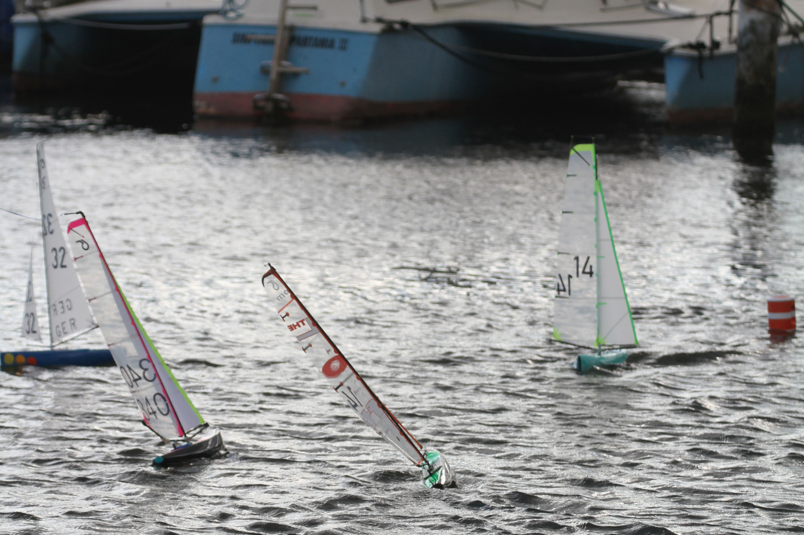 Vier Rennen sehen auf dem Blatt Papier nicht viel aus, aber bei Mittel- bis Starkwind (B bis C-Rigg Bedingungen) war es gerade für die Newcomer in der Klasse (Maciek und Kay-Uwe mit Leihbooten) schon teilweise abenteuerlich. Maciek (erfahrener IOM Segler) hatte einen Servodefekt direkt im ersten Rennen und er ist mit meinem Boot weiter gesegelt. Ich mache ja auch gern Fotos. In R4 gab es eine Kollision von Kay-Uwe und Torsten, aber das RC Rettungsboot hat die Yachten sicher zurück an Land gebracht. Danach wurde noch etwas frei in den Bedingungen das „Bootshandling“ trainiert. Jürgen ist parallel mit seiner IOM ein paar Trainingsschläge gesegelt.