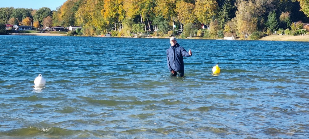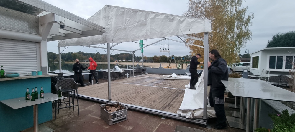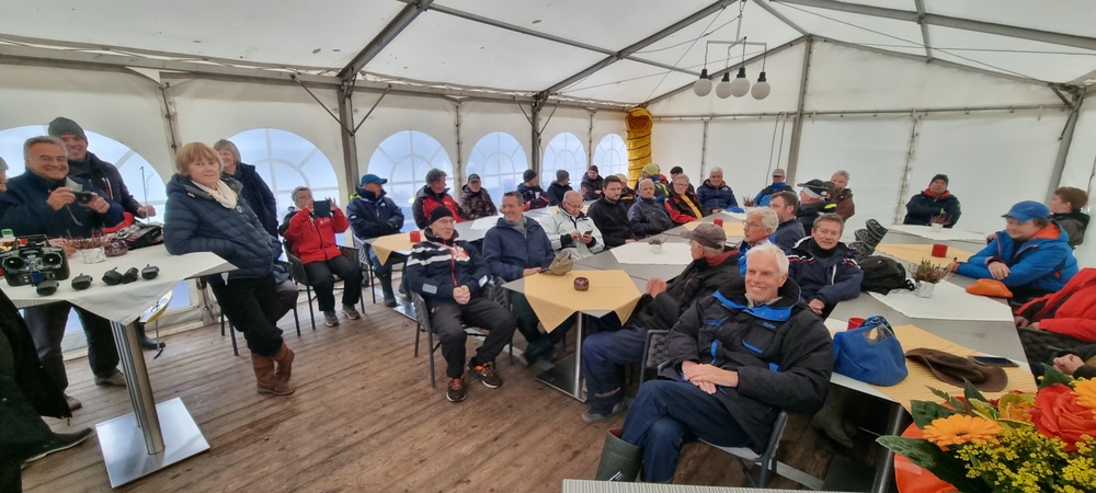 Das aufgrund der großen Teilnehmerzahl extra aufgestellte Zelt direkt an der Gaststätte Seeblick hat sich vor allem heute bestens bewährt, der Heizungsausfall am Samstagabend war dann auch zu verkraften, und um so gemütlicher war es dann später in der "vollen Hütte" mit über 40 Personen .....