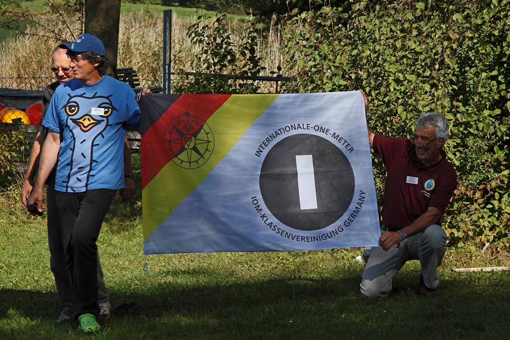 Zur Eröffnung der Deutschen Meisterschaft waren jedoch nur 4 Masten beflaggt, der Grund dafür wurde schnell bekannt. Denn Peter Hackl und Hans Dieter Krings hatten die Idee, eine eigene Flagge für die IOM Klassenvereinigung zu entwerfen. Peter Hackl , der künstlerisch begabt ist, entwarf dann eine Flagge, die auch von anderen Nationen der IOM Klassenvereinigung mit jeweiliger Landesflagge genutzt werden kann und im Zuge der Begrüßung wurde diese Flagge durch den Klassenvorsitzenden – Hans Dieter Krings – erstmalig gehisst.