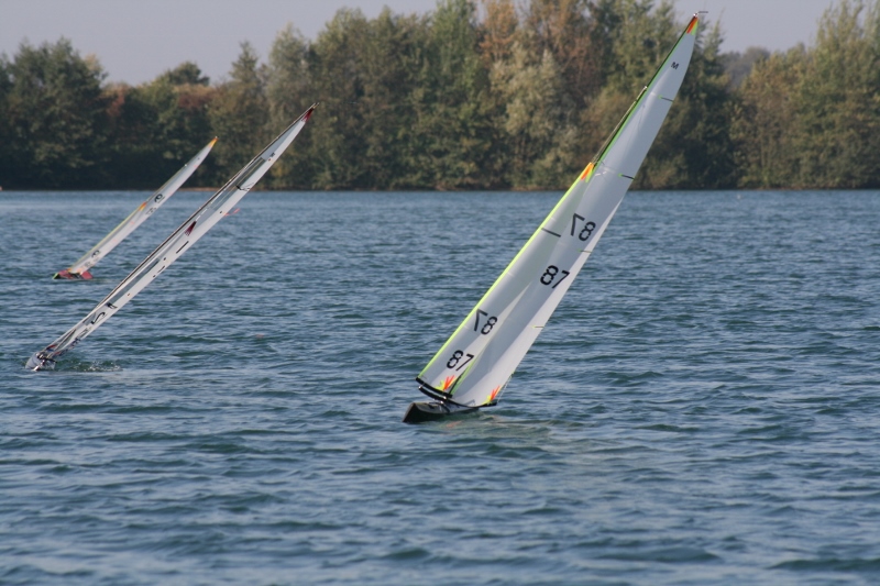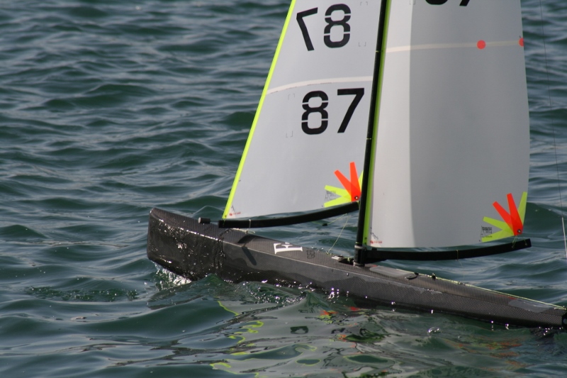 Unser Gast aus Frankreich ist ein wahrer Leichtwindspezialist. Auch sein Boot (Designname ist mir leider entfallen) ist ein Spezial Leichtwindboot. So konnte er am ersten und letzten Tag bei wenig Wind ganz vorne mitfahren, aber bei den 10 Läufen am Samstag landete er dann leider sehr weit hinten.
