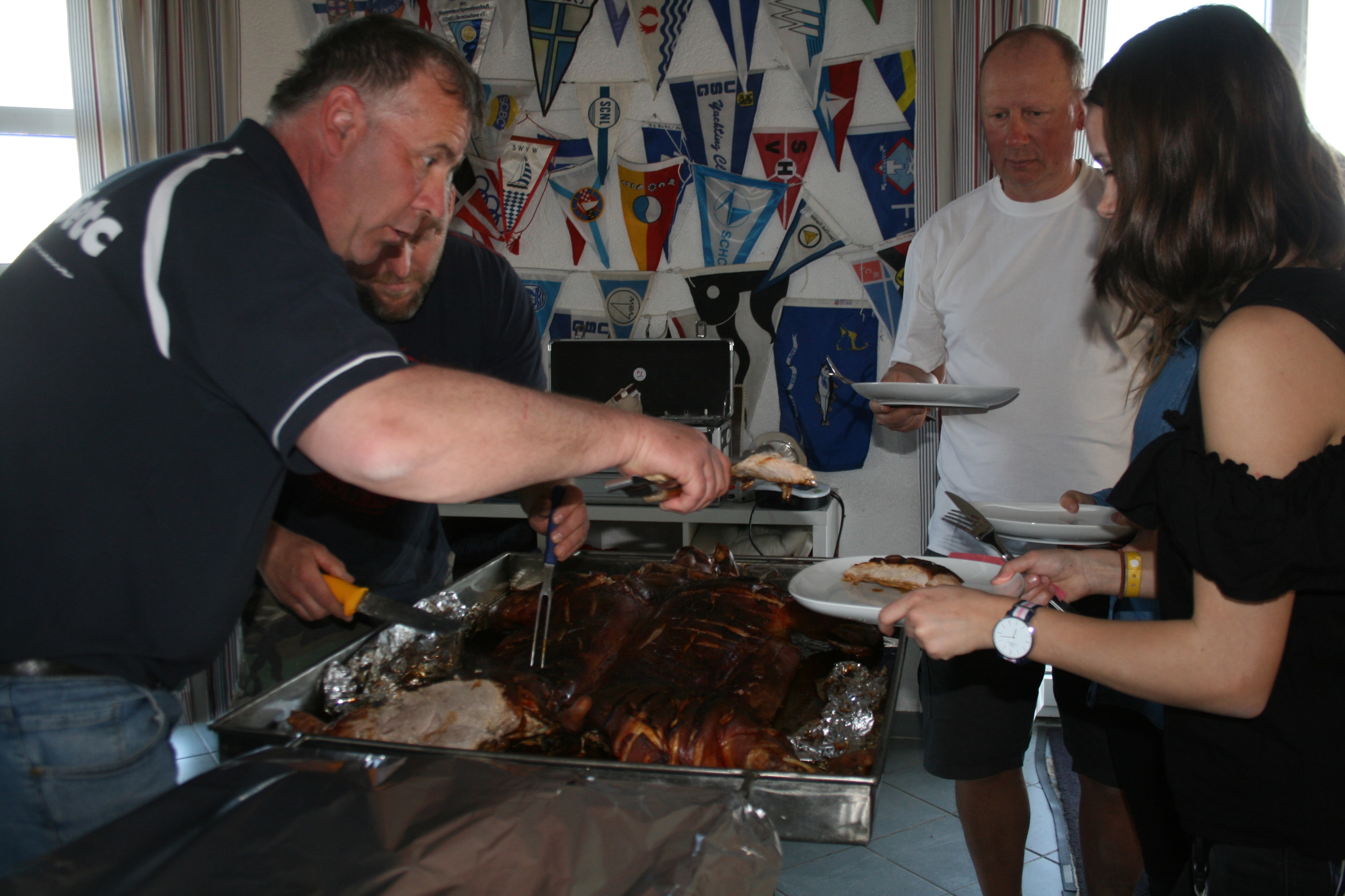 3 Dinner waren zu planen und zuletzt kamen sehr viele Segler bereits einen Tag früher so dass spontan noch ein Abendessen am Mittwoch eingebaut wurde. Am Donnerstag hatten wir das so genannte International Dinner bei dem jeder Teilnehmer eine Kleinigkeit aus seiner Region beitrug. Das war ein voller Erfolg bei der Internationalität de s Teilnehmerfeldes auch kein Wunder. Am Freitag hatten wir leider zu wenig Schinkenbraten und Salat eingekauft. Offensichtlich genügen 200gr Fleisch und 200gr Salat nicht pro Teilnehmer zumindest nicht für jeden und so musste spontan noch eine Portion Spaghetti Bolognese für die restlichen Teilnehmer gekocht werden. Am Samstag hatten wir dann mit zwei ganzen Spanferkeln ausreichend zu essen. Die Reste konnten noch am Sonntag verzehrt werden. Die Erkenntnis: es ist zwar günstiger das Essen selbst einzukaufen und zuzubereiten aber organisatorisch wahnsinnig aufwendig. Künftig wird die Sau beim Metzger bestellt und fertig.