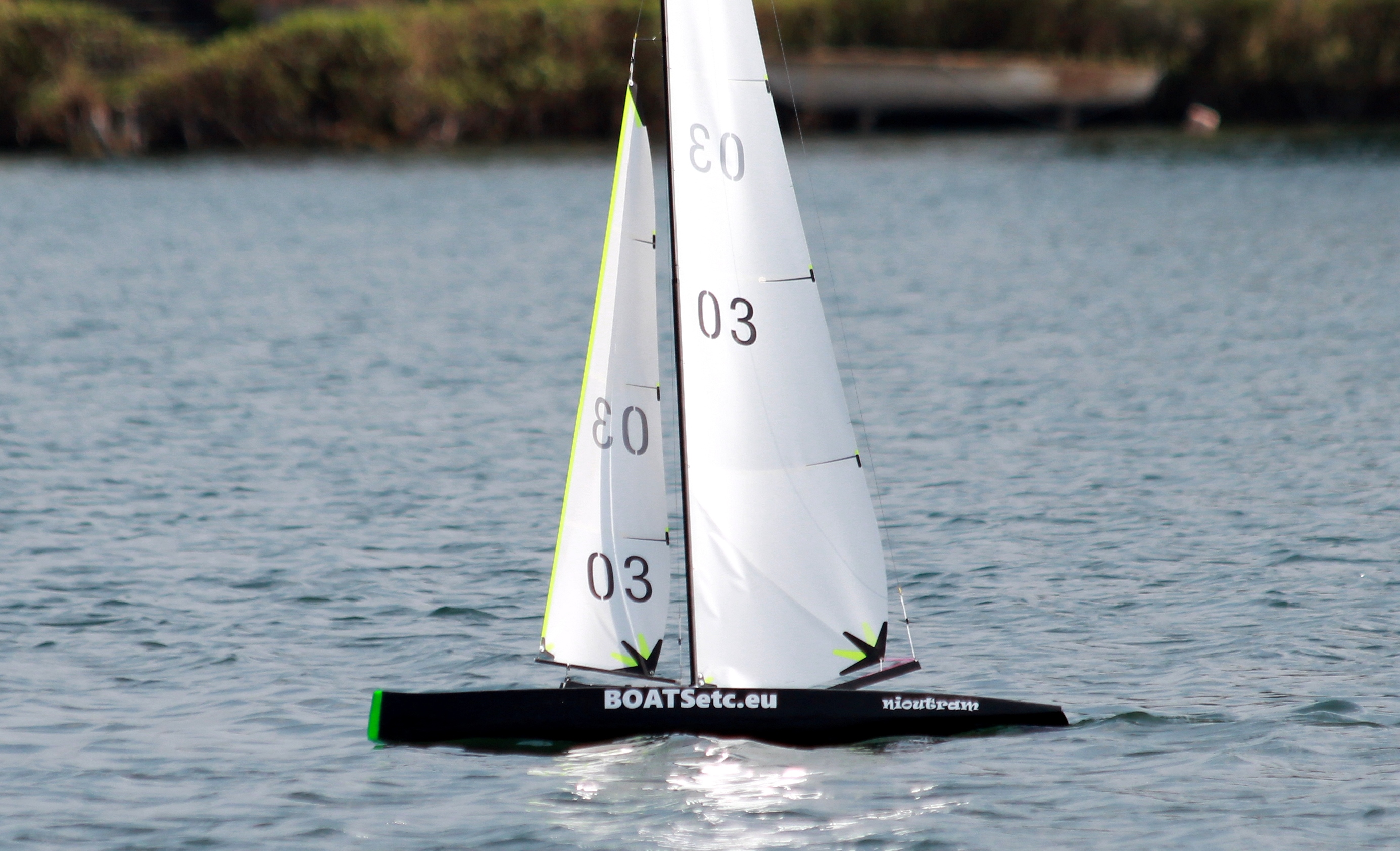Aber was nützt das beste Boot, wenn dazu nicht auch noch ein gutes Rigg kommt. Die Nioutram wurde von der Tramontane abgeleitet und von Marc Pomarede gebaut. Bald wird dieses Design auch bei uns über boatsetc.eu erhältlich sein. Die Riggs dazu stammen bei den Franzosen um Remi Bres von diesem genialen Segel- und Riggbauer. Alle A-Riggs sind mit der bekannten Bresmo-Verstellung ausgerüstet (eine ausführliche Beschreibung ist auf der DSV-radiosailing-Seite zu finden) und die Segel sind von allererster Qualität in puncto Design und Ausführung. Sie unterscheiden sich von dem, was bisher bei M Standard war. Das Profil liegt relativ weit vorne bei ca. 30-35% (eher 30?) und die Profiltiefe liegt bei geschätzten 6 1/2 - 7 1/2%. Die Segel haben 1-2 Nähte mehr als üblich. Die unterste Naht liegt dabei recht tief und damit näher am Unterliek. Das Unterliek selbst wird fast dicht gefahren. So bildet sich zwischen der profilierten unteren Naht und dem flachen Unterliek eine "Tasche", die die Verwirbelung und den Druckausgleich am Unterliek verbessern soll. Ob das alles so ist, zeigt nur die Praxis; und da alle, die mit solchen Segeln ausgerüstet waren, vorne mit dabei waren…