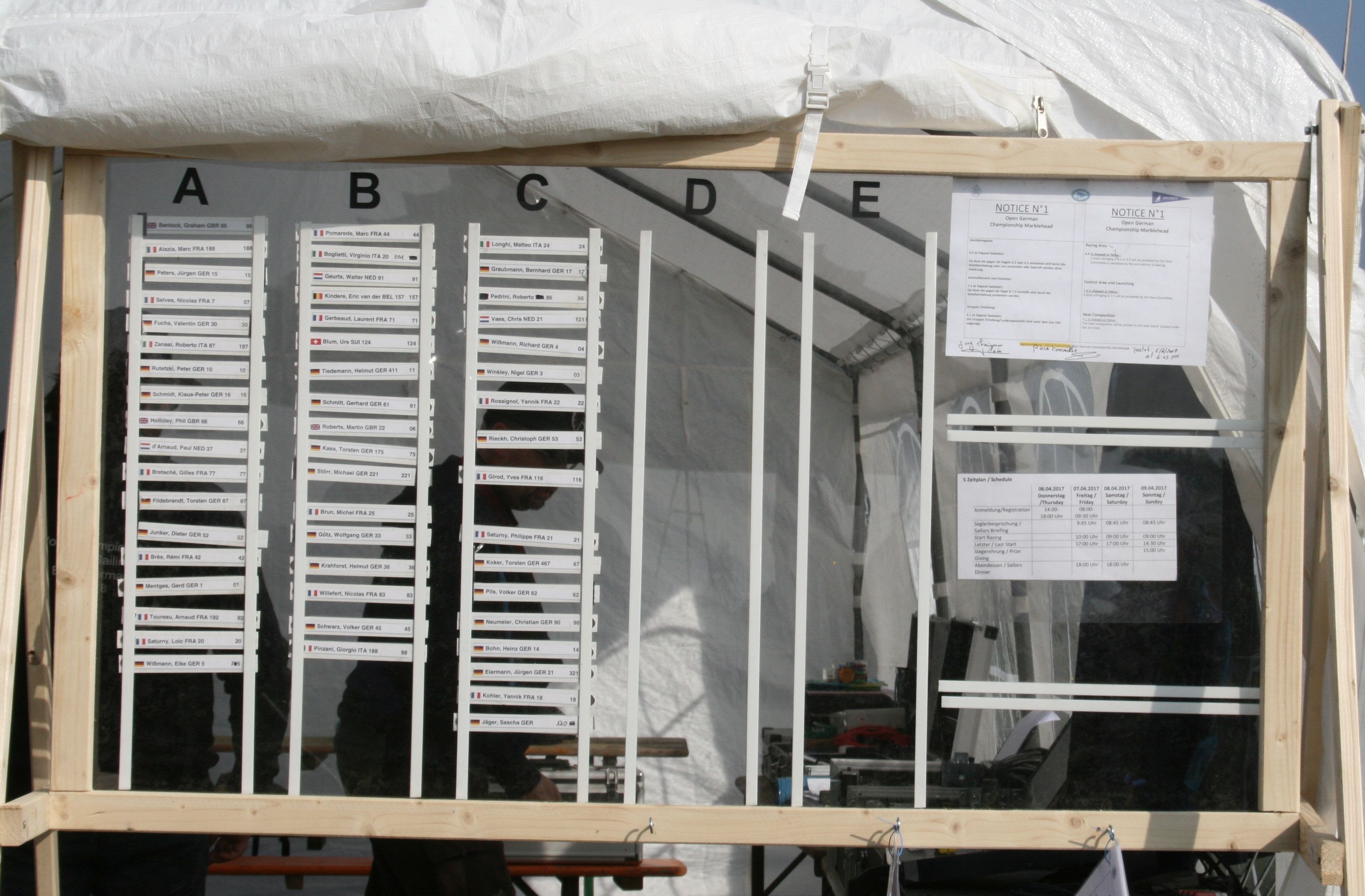 er Probleme gegeben, die ich unbedingt vermeiden möchte. Da ich selbst Informatiker bin habe ich auch kein großes Vertrauen in solche Systeme. Bei den letzten Veranstaltungen in Biblis kam es immer wieder vor, dass Segler am Raceboard Änderungen vornahmen oder zumindest die Manager des Boards gestört hatten. Daher baute ich ein Board aus Plexiglas mit Magnetischen Tafeln die beidseitig beschriftet waren. Alle Segler können zuschauen was gemacht wird aber die Manager werden nicht durch dazwischenreden gestört. Einzig die Magnete müssen noch etwas stärker gemacht werden und den Upload der Ergebnisse müssen wir noch einrichten. Ansonsten hat die Lösung sehr gut funktioniert.