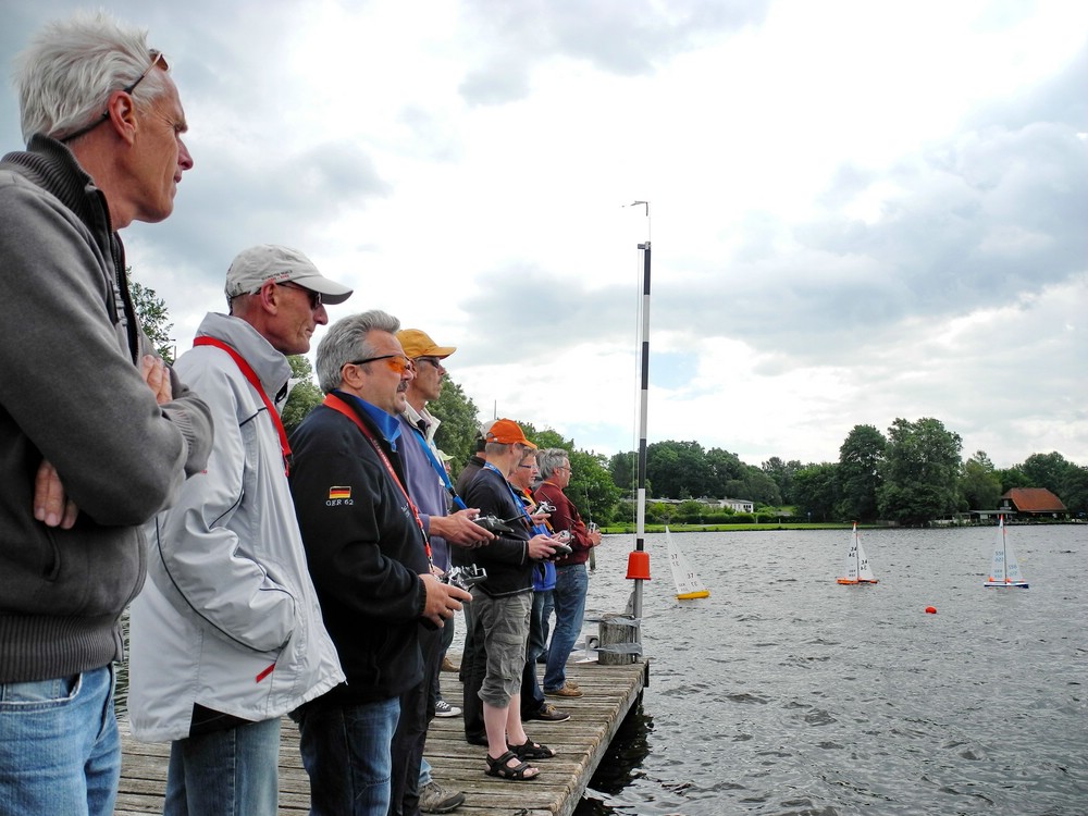 Die Sonne meinte es gut mit uns, bis auf eine kurze Nieselregenphase. Im Laufe des Samstages legten wir unsere Jacken ab und mir (Autor Max) musste wohl unter der Freude, dem Ragattafeld uneinholbar davon geeilt zu sein, so warm geworden sein, dass ich ein Bad in der Wakenitz nahm. Nein – Max und freiwillig in kaltes Wasser springen und dann noch mit dem teuren Sender in der Hand? Plötzlich war der Steg zu kurz....und „Schei...“. Leider waren die potentiellen Zuschauer mit dem Steuern ihrer Yacht beschäftigt, so dass nur einige Segler der B-Gruppe und Zaungäste am Ufer die Sondereinlage mitbekamen. Zum Ärger von Tommy und Frank, die an 2. und 3. Stelle lagen, brach Carsten das Rennen ab.