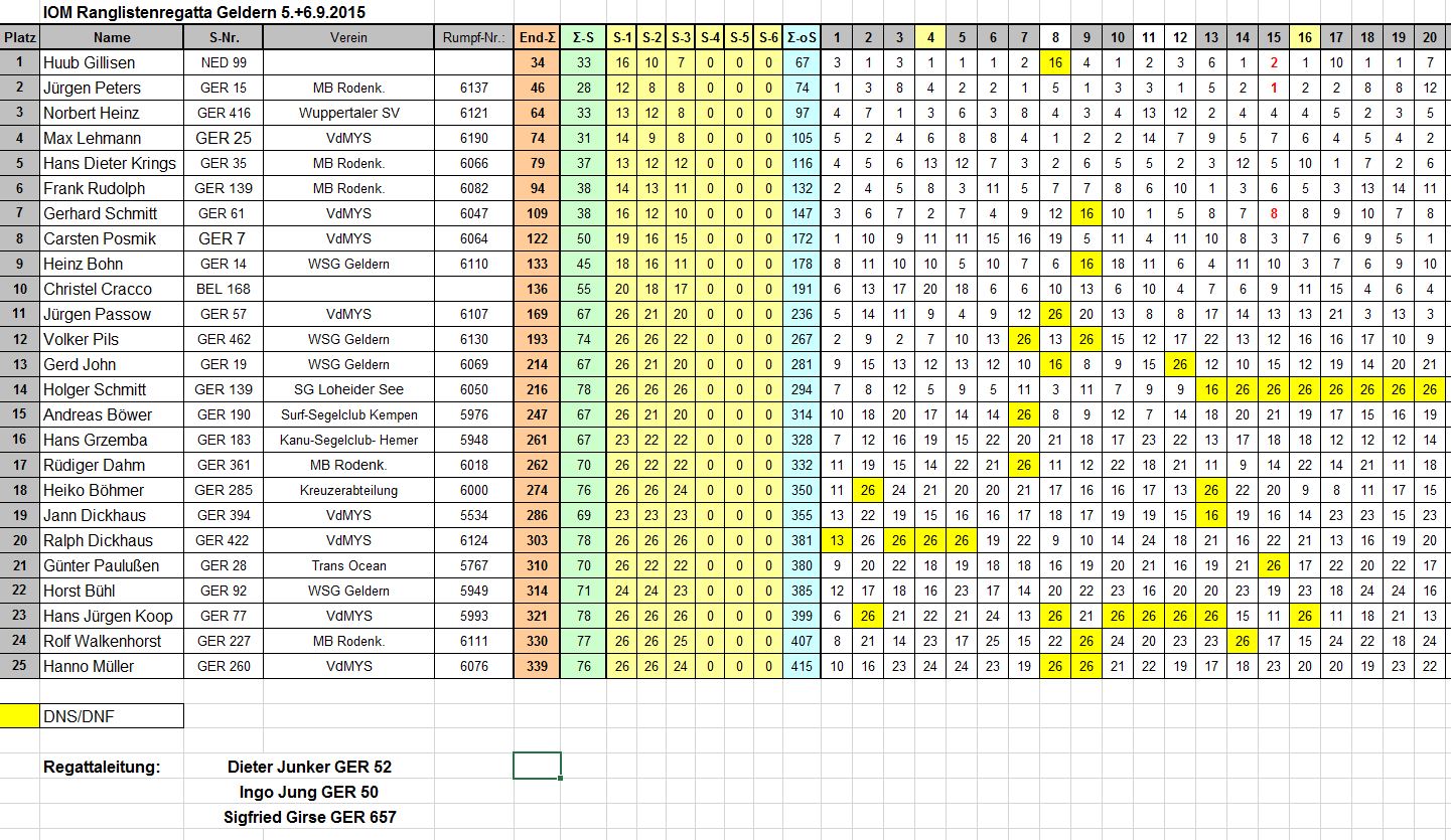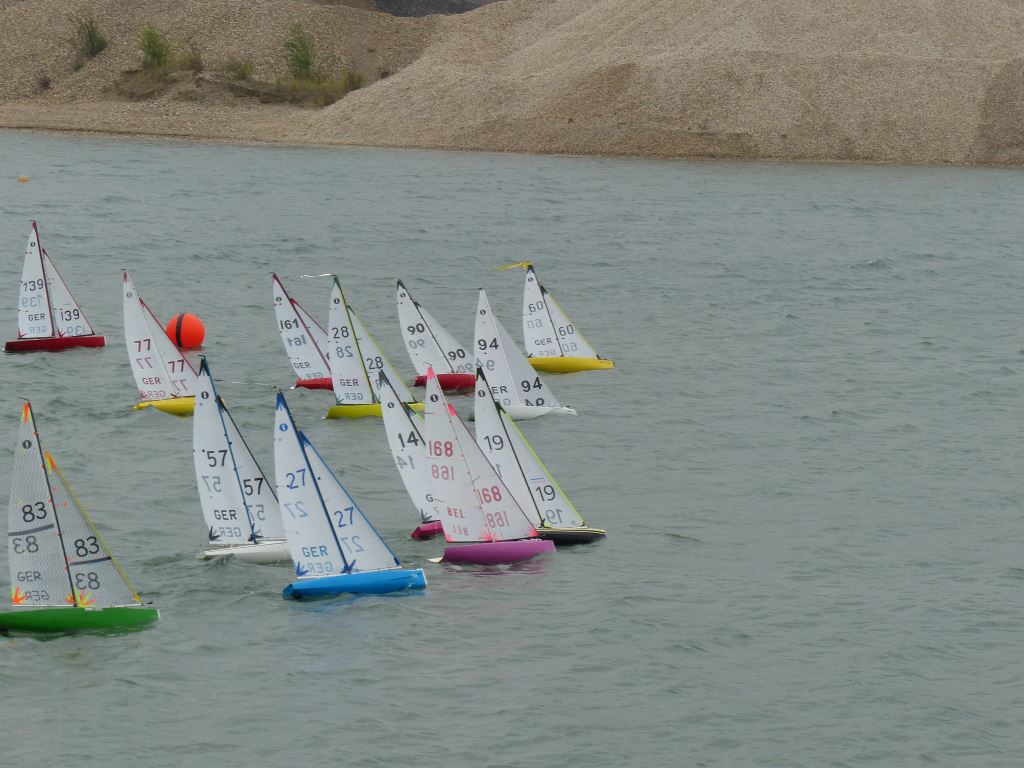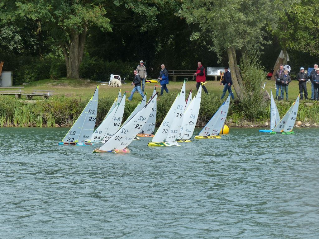 IOM-Regatta 5./6. Sept. 2015 in Geldern. Optimaler Wind von Westen, genau den See entlang, manchmal A-Rigg, manchmal B. Kein Kraut! Nur wenig Regen. Dieter Junker war ein durchsetzungsstarker Umpire, und auch seine Helfer zum Aufschreiben der ankommenden Boote bis hin zum „Observer-Vergabe-Manager“ hatten alles gut im Griff.