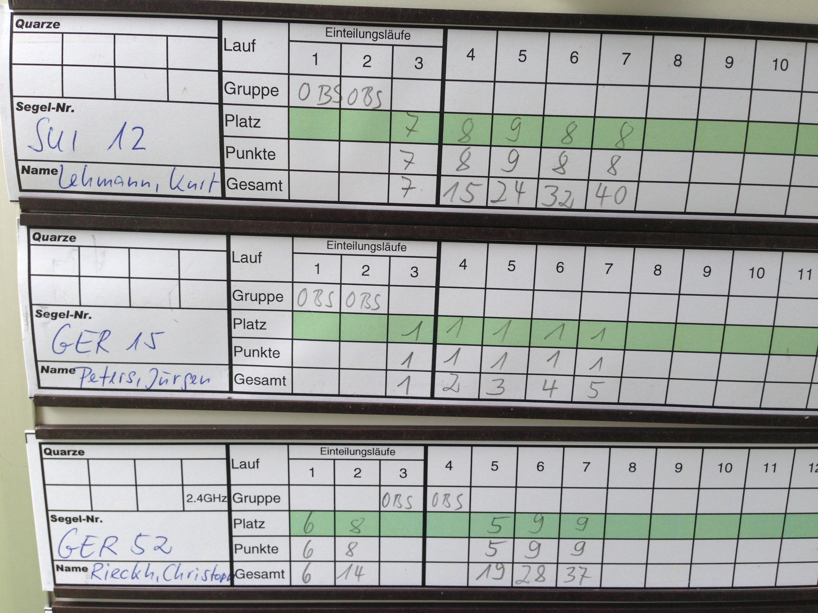 Leider erst ab dem 5. Platz reihten sich die Schweizer Teilnehmer Gustl Albiez SUI 55 Viry Easy mit sehr schönen selbst gebauten Segeln und Thomas Tochtermann SUI 77 mit Viry Easy ein. Auf dem 7. Platz folgte Urs Blum mit einer selbst gebauten Graffito die vor allem am dritten Tag mit B-Rig ihre volle Geschwindigkeit zeigen konnte. Dahinter nach langer Abstinenz von den richtigen Segelklassen Christoph Riekch der ebenfalls vor allem am dritten Tag bei viel Wind mit seiner Narbig vorne mitfahren konnte. Die drei folgenden Schweizer Roger Klauser SUI 11, Bernhard von Dach SUI 76 und Kurt Lehmann SUI 12 konnten leider nicht an allen Tagen mitsegeln und mussten sich daher mit hinteren Plätzen zufrieden geben.