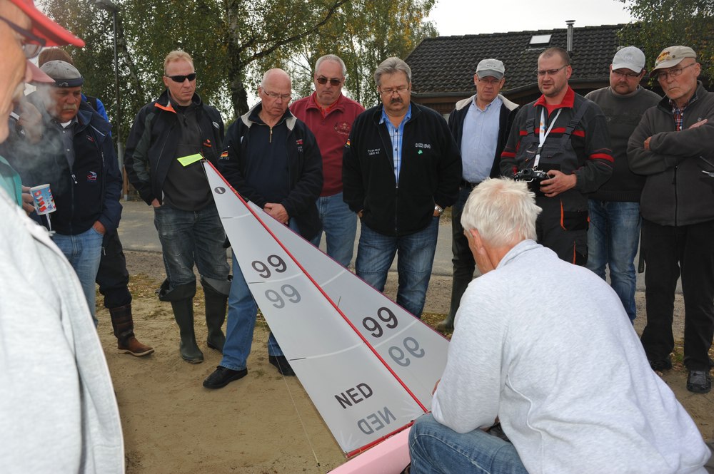 Samstagmorgen ließ der Wind auf sich warten - es wird vermutet, das die Ausschreibung vergessen wurde zu Petrus zuschicken. Nach einer entspannten Wartezeit und einer kleinen Trimm-Vorführung von Huub Gillissen - danke dafür -, versuchte Wettfahrtleiter Nigel Winkley einen Testlauf. Der Wind war nicht perfekt, aber für unseren Wettfahrtleiter segelbar. Der streifige Wind ließ die IOM´s unterschiedlich schnell auf dem Wasser segeln, wodurch oft die Plätze durch einander gewürfelt wurden. Nach einer längeren Kuchenpause und gleichzeitiger Umbauphase des Kurses, sind weitere Läufe gesegelt worden. Leider wurden am Samstag nur 7 Läufe geschafft.