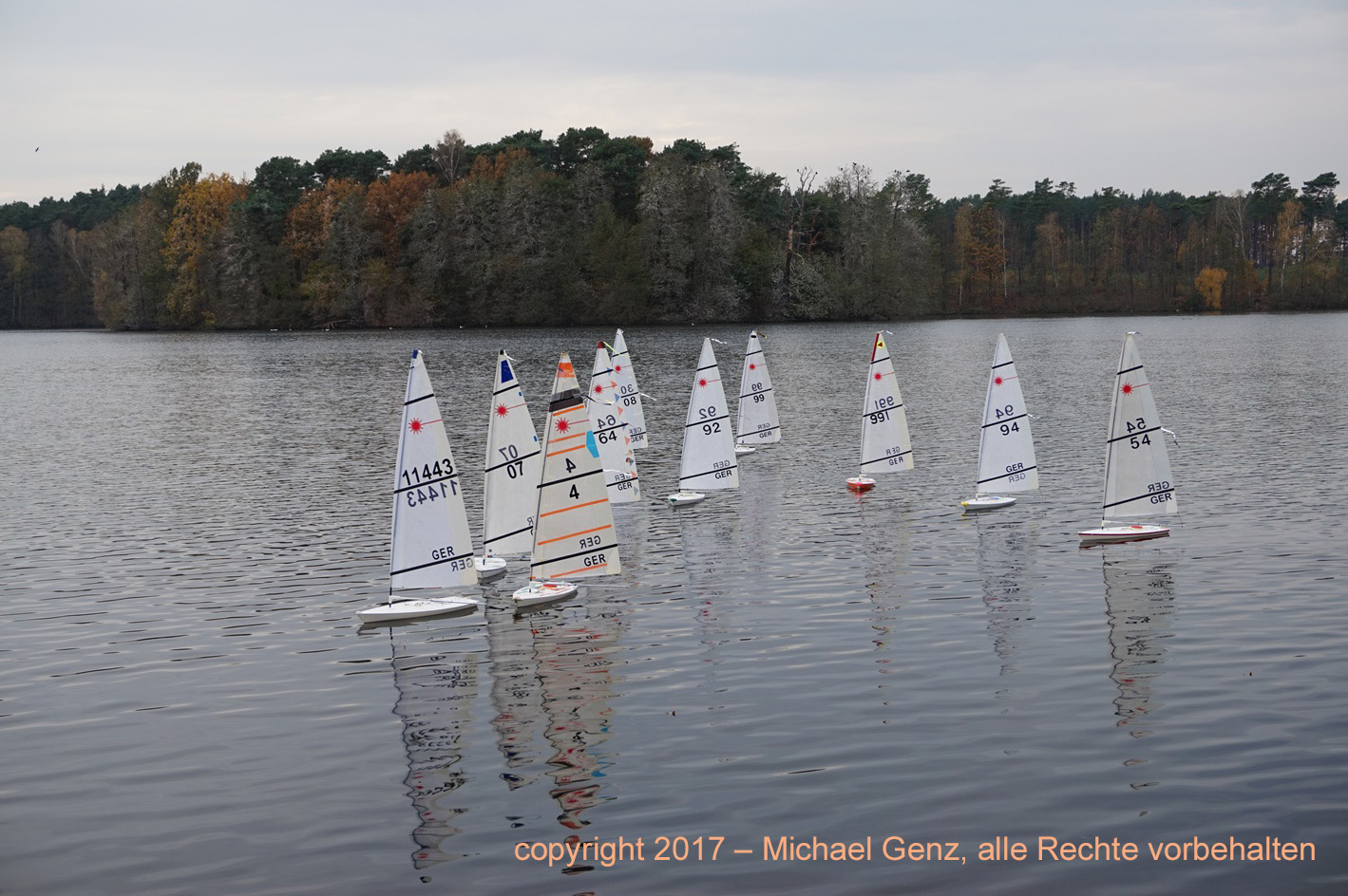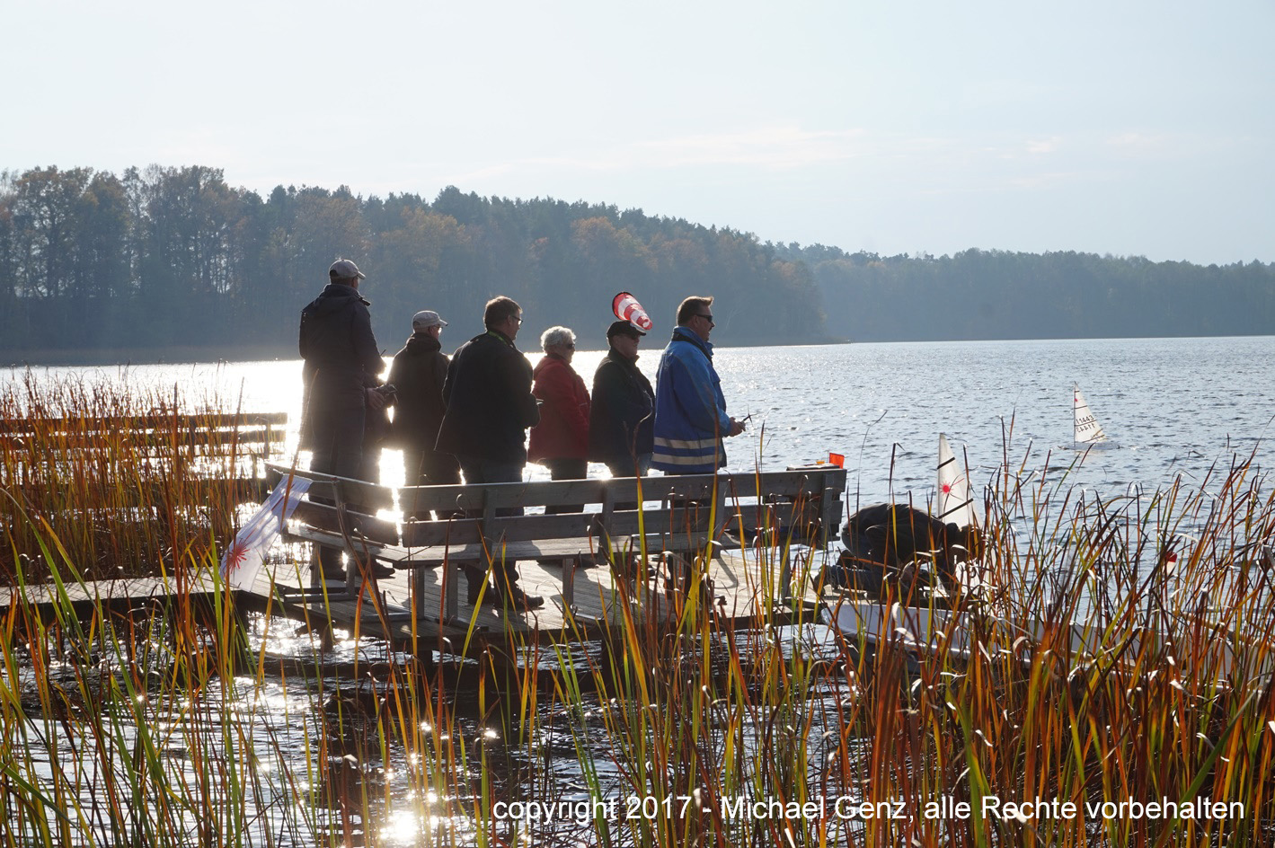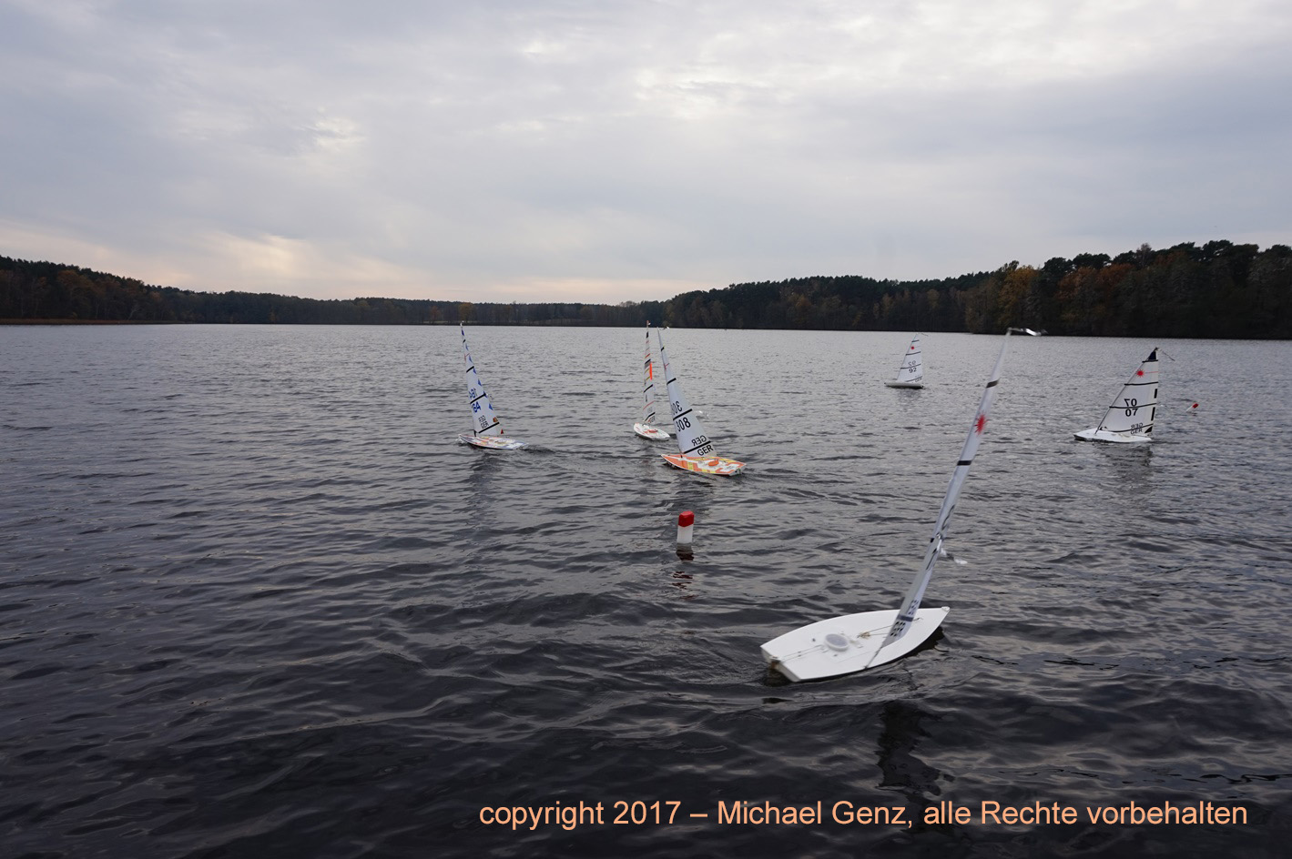 Den Winddrehern und Flautenlöchern, mit denen uns die Natur immer wieder überraschte, konnten wir nur mit Humor begegnen; entsprechend unterhaltsam ging es auf dem Steg zu. So folgte einem stetigen Wind in der Vorstartphase „5, 4, 3, 2, 1“ auf den Punkt mit dem Startsignal mehrfach plötzlich Flaute. Besonders interessant war das Passieren von Bahnmarke 3; infolge einer Windabschattung in Verbindung mit einer vermuteten leichten Unterwasserströmung war hier Fingerspitzengefühl gefragt.