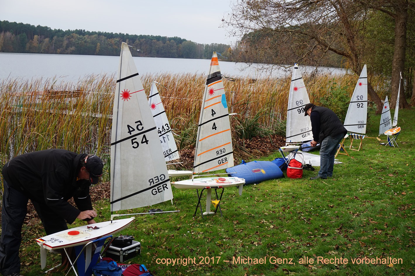 Während meiner angenehmen Anreise wurde ich vom goldenen November begleitet. Bei meinem Eintreffen freute ich mich über den herrlichen Wind und die neun RC-Laser bei strahlendem Sonnenschein auf dem Wasser. Die anderen Teilnehmer waren schon beim Trainieren und Trimmen des B-Segels.