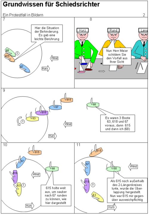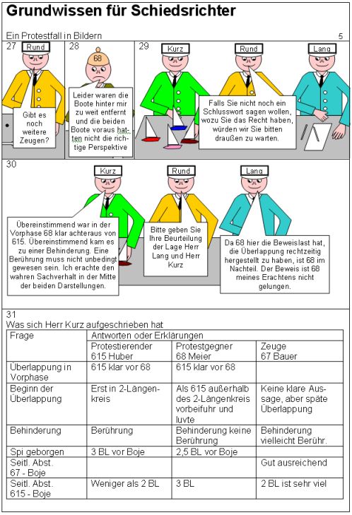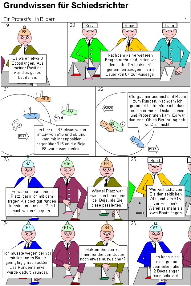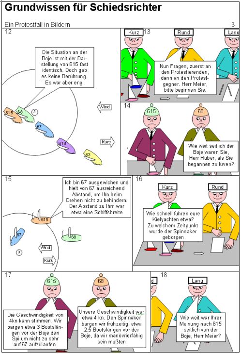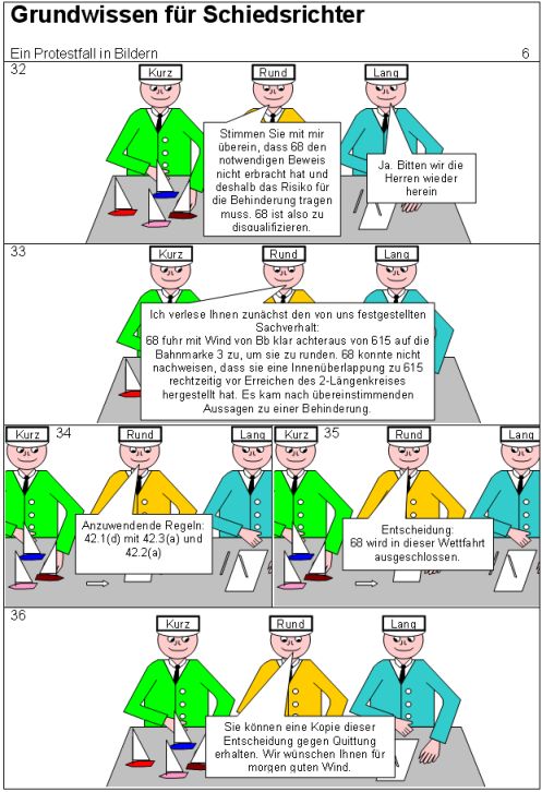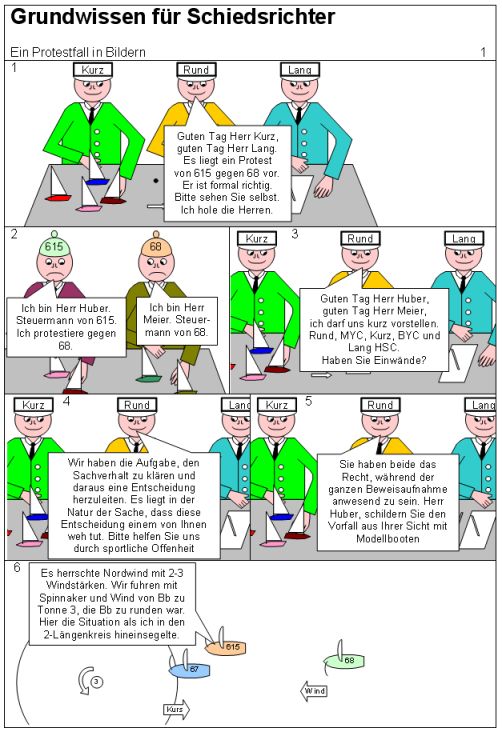 Der Ablauf einer solchen Verhandlung ist in den Wettfahrtregeln nicht irn Detail beschrieben, es gibt vom DSV jedoch ein Handbuch für Schiedsrichter mit dem Titel „Segeln nach Regeln". Hier finden sich viele praktische Hinweise zu diesem Thema. Der Ablauf einer Protestverhandlung wird sogar in 36 Bildern in einprägsamer Comic-Manier gezeigt.