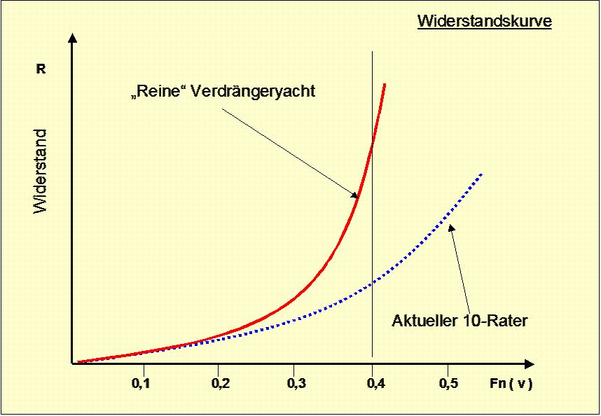 Einmal wird eine Widerstandkurve gezeigt, ähnlich der unten dargestellten, aber für Verdränger und im Vergleich für einen modernen Volvo Ocean Racer. Letztere Yachten zeigen einen Widerstandverlauf im Bereich von Fn=0,4, der dem unserer 10-Rater ähnlich ist. Auch die Volvo Ocean Racer erreichen Gleitfahrt.