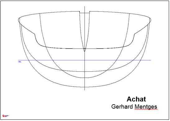 Die Achat habe ich entworfen für Hartmut Neubert, der den Wunsch hatte nach einem schmalen und sehr langen 10er. Die Achat ist, wie man an den Tabellenwerten erkennen kann auf schnelle Verlängerung der Wasserlinienlange bei Krängung entworfen. Diesbezüglich erreicht sie fast die Werte der Diamond. Die Achat hat bei reiner Verdrängerfahrt, also bei Geschwindigkeiten unter FN 0,4 ein sehr hohes Potential. Von der Spantform her ist die Yacht uspantig und damit bezgl. des Tiefgangs eher gemäßigt.