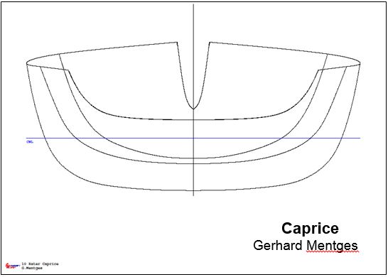 Die Caprice ist ein Entwurf nach Vorgaben von Dietmar Lux auf Basis eines älteren englischen Risses für eine Binnengewässeryacht mit hohen B/T Verhältnis. Interessant ist der Vergleich mit der Karneol, die ebenfalls auf Formstabilität setzt aber mit trapezspantigem Hauptspant. Wie nicht anders zu erwarten, hat die Caprice die größte benetzte Oberfläche, immerhin 13% mehr als die Viry Easy.