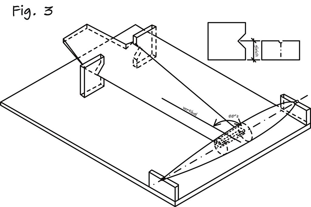 Natürlich müssen Flosse und Bleigewicht auch in Längsrichtung korrekt ausgerichtet werden. Sobald die Flosse korrekt mit dem Rumpf ausgerichtet wurde, genügt eine visuelle Kontrolle, dass Bleigewicht und Rumpf ebenfalls korrekt aufeinander ausgerichtet sind. Wenn die Ausrichtung nicht stimmt, können sie hierfür die Vorrichtung aus Abbildung 3 verwenden.