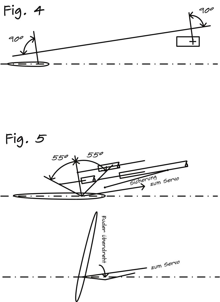 Es ist wichtig Servohebel, Verbindungsgestänge und Ruderhebel genau auszuführen, um die gewünschten 55 Grad Ausschlag in beiden Richtungen gleich zu erhalten.