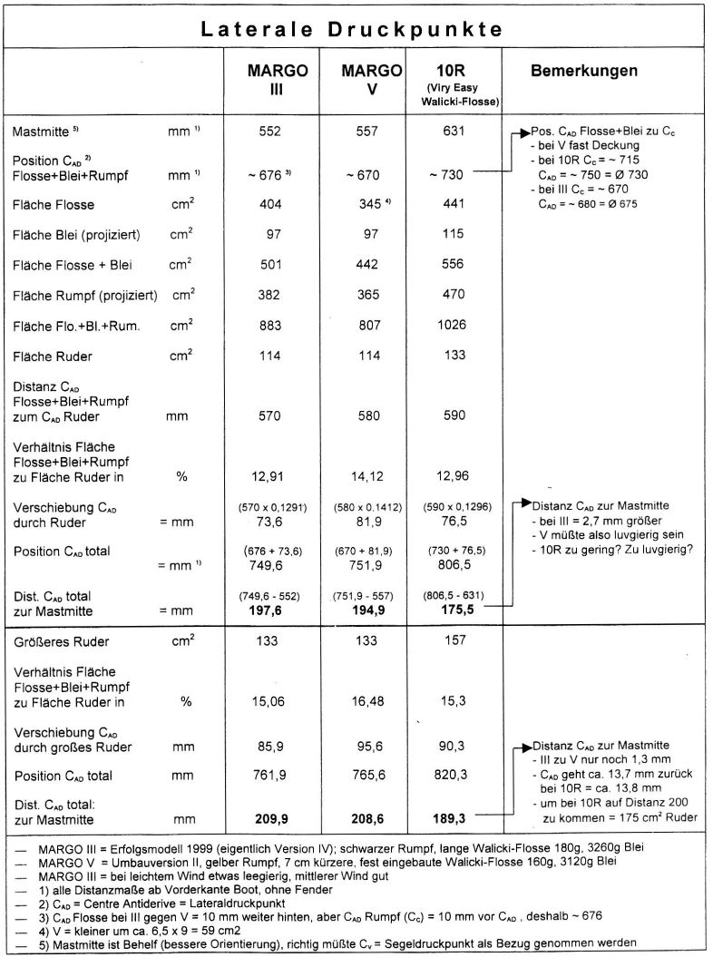 Zurück zur nicht notwendigen Ehrfurcht. Das Ergebnis war, daß der Lateraldruckpunkt der neuen Flosse trotz allem Maßnehmen um Ca. 1 cm weiter vorn lag. Also die ganze Arbeit noch einmal? Bevor ich startete, machte ich mich (endlich) daran, doch einmal genauer zu rechnen und wie zuvor empfohlen, A L L E Druckpunkte genauer zu bestimmen. um zu wissen, wo ich tatsächlich liege. Für mein 10R-Boot wollte ich dies auch wissen und nahm die Berechnungen auch mit auf. Herausgekommen ist die nachstehende Tabelle. die ich zum Studium freigebe. Hieizu noch einige Erklärungen zu den einzelnen Punkten: